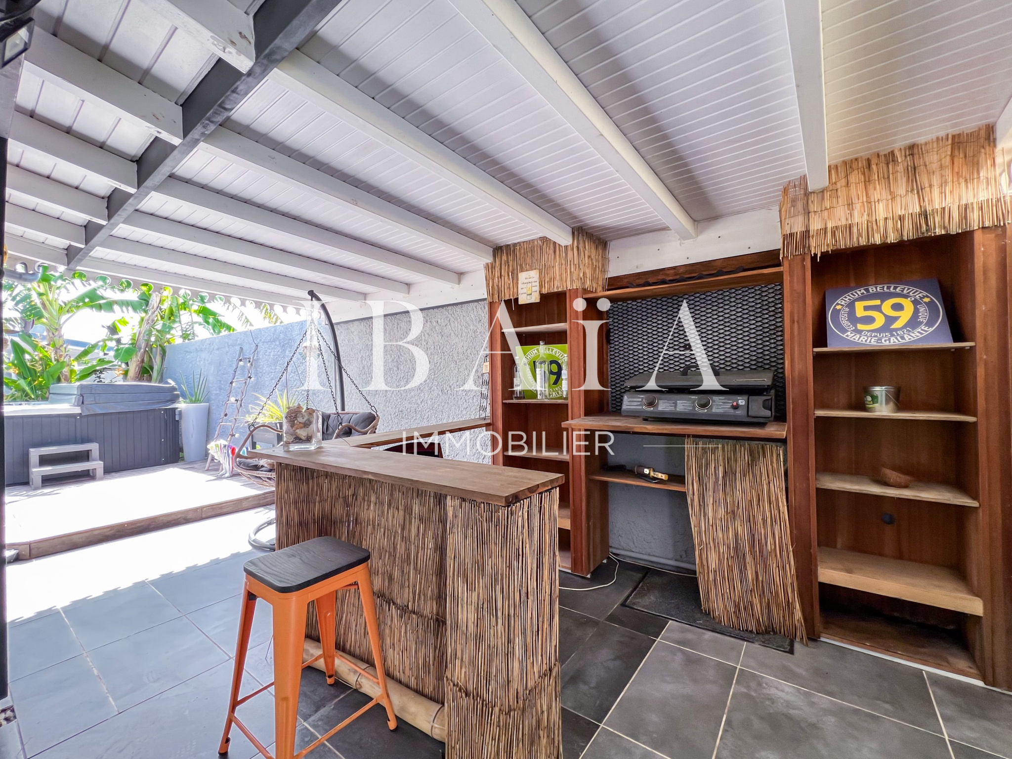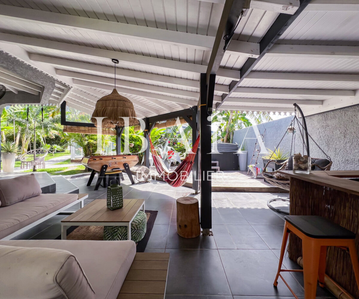 – Une grande terrasse couverte de 70 mètres carrés comprenant un espace salle à manger et un deuxième espace de détente où vous trouverez un salon extérieur, un bar avec plancha, un espace de jeu avec baby-foot ainsi qu’un espace de relaxation avec un jacuzzi 6 places.