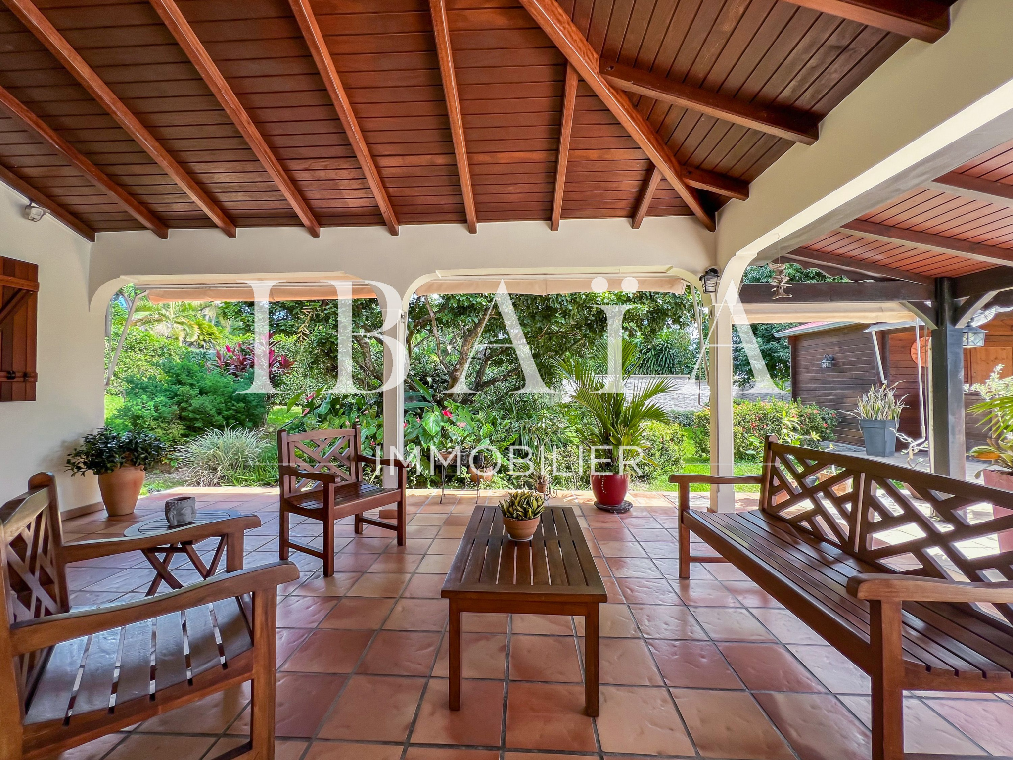 L’ensemble des pièces de vie s’ouvre sur une vaste terrasse couverte, véritable pièce supplémentaire aménagée en espace salon et repas, le tout faisant face à la piscine.