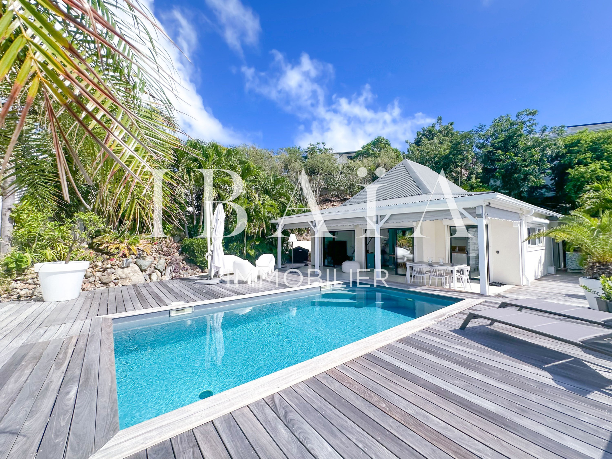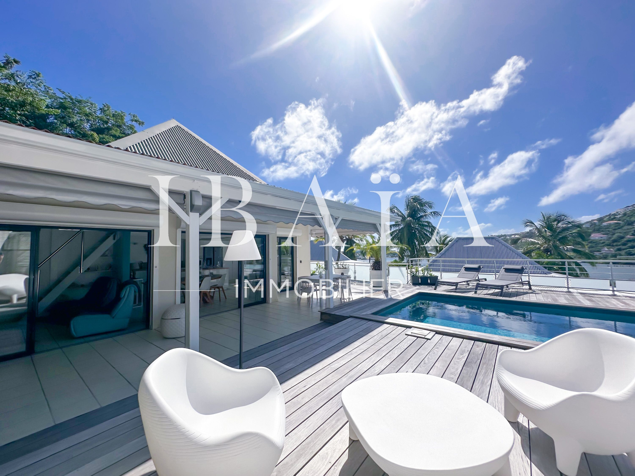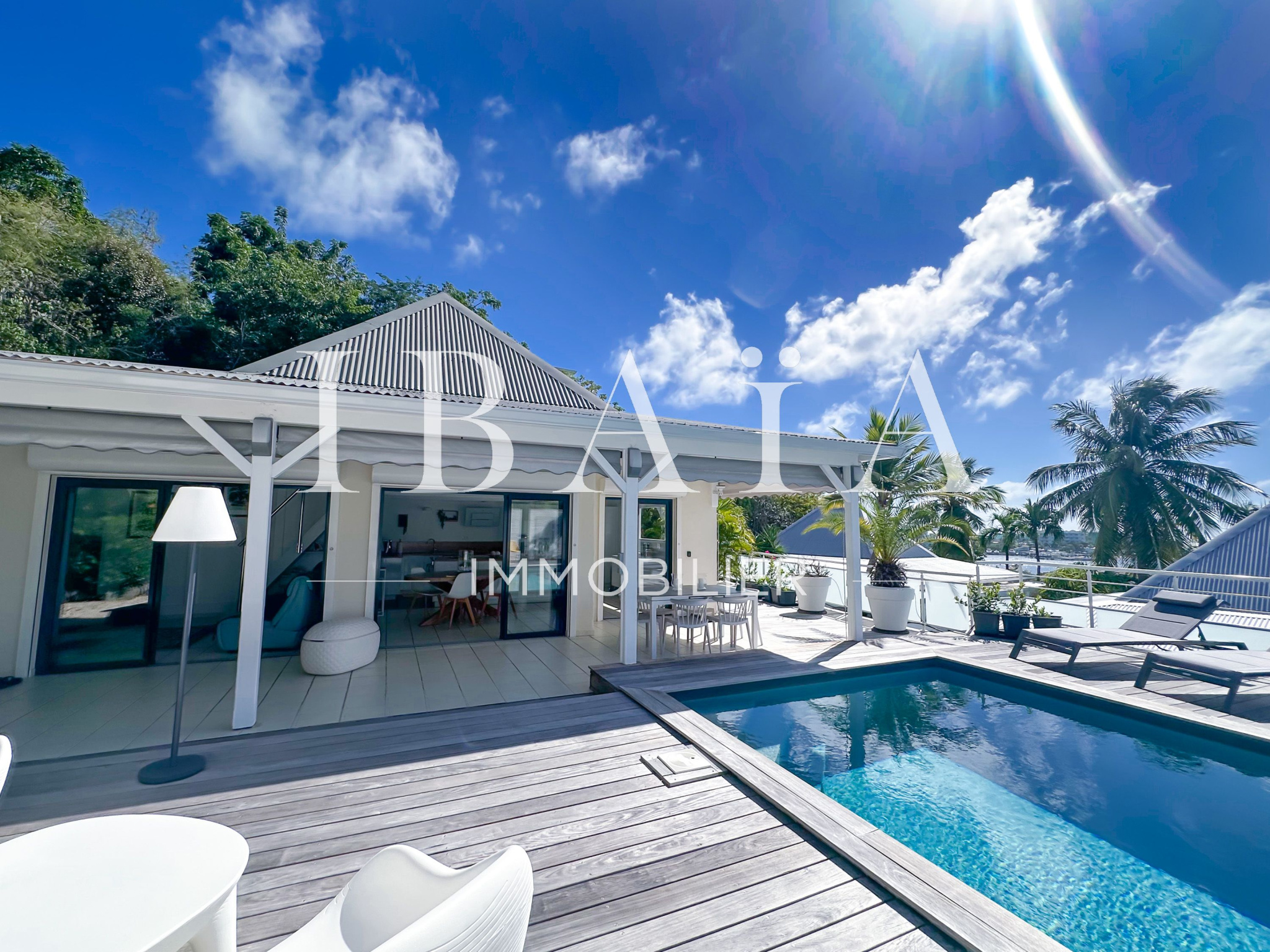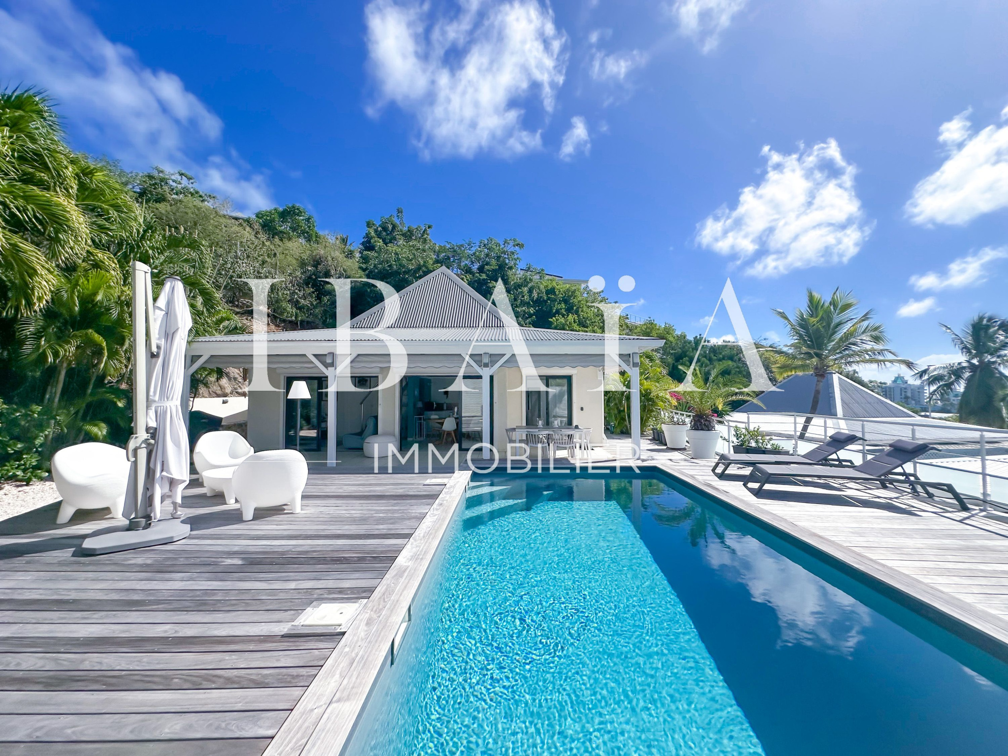 Idéalement située en partie française, à proximité immédiate de la partie hollandaise, la villa bénéficie d’une exposition remarquable face à la marina et offre une vue dégagée sur l’île de Saint-Barthélemy.