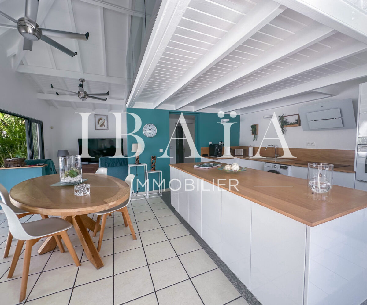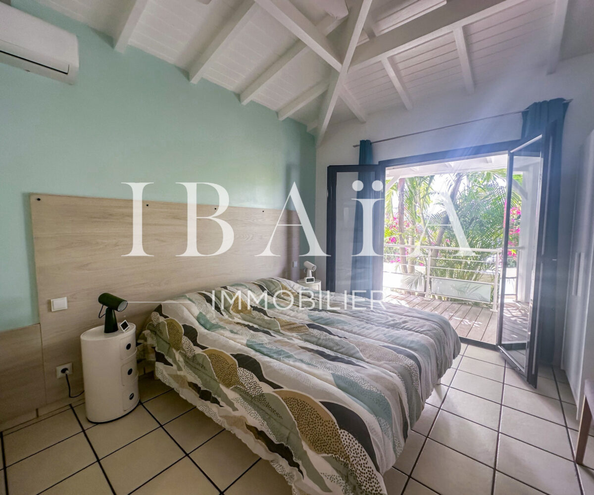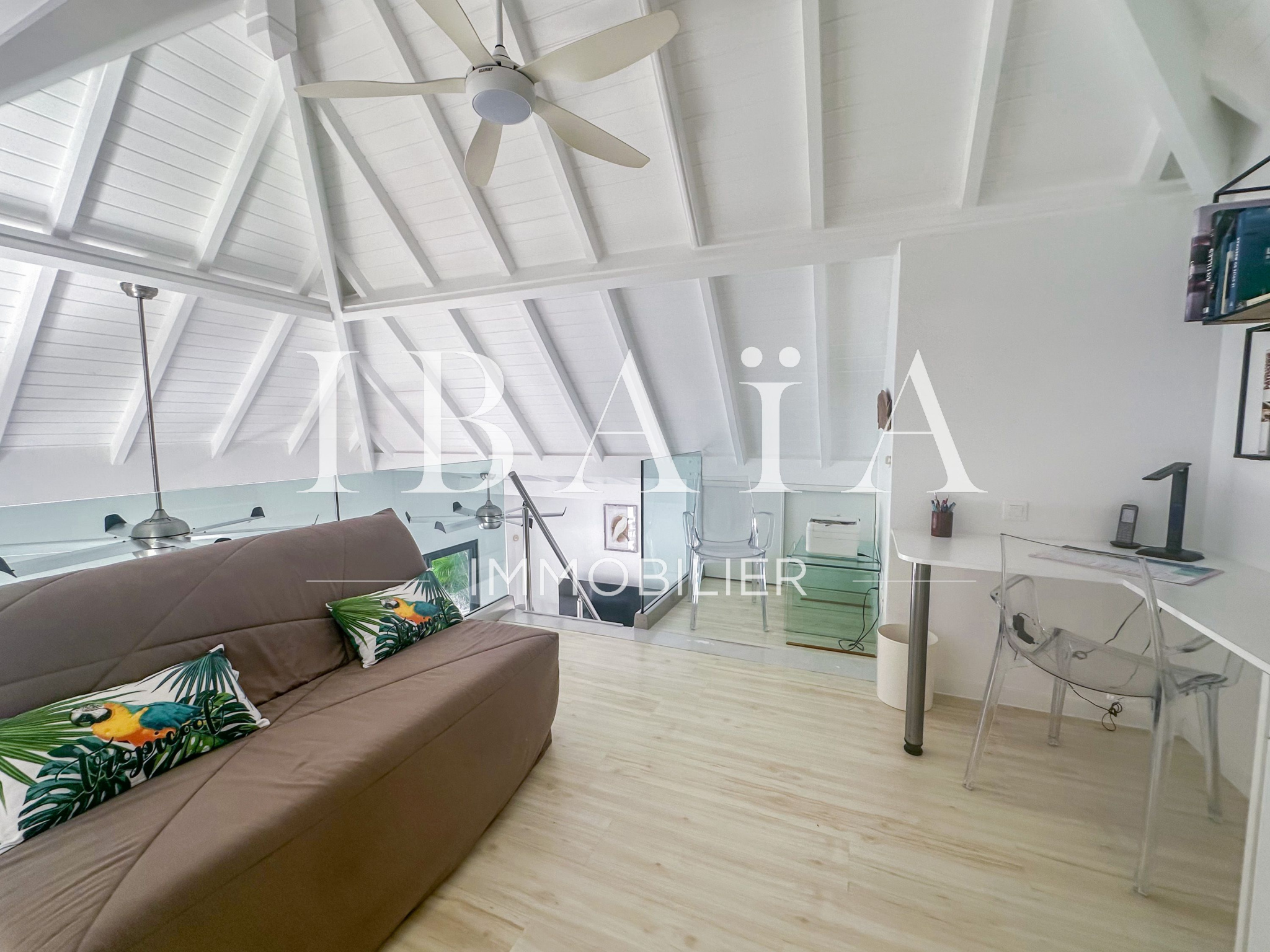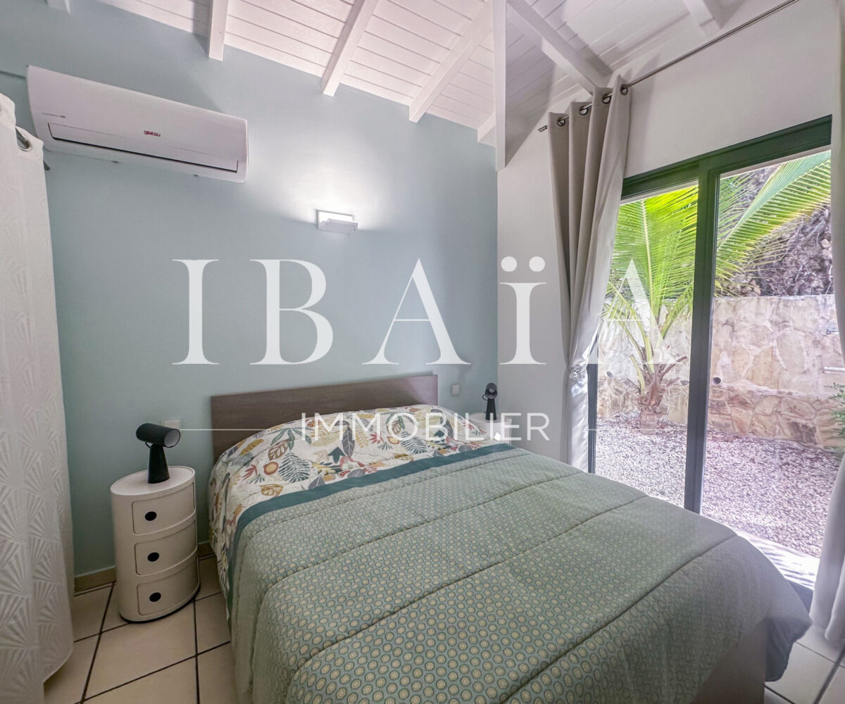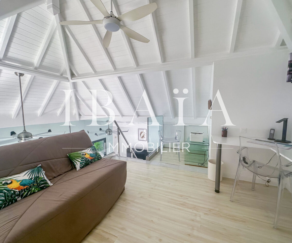 Cette villa d’exception se compose de deux chambres spacieuses. Une troisième pièce, aménagée en mezzanine, est actuellement utilisée comme bureau et dispose d’un canapé-lit, offrant ainsi une grande flexibilité d’utilisation. Le séjour, baigné de lumière, s’ouvre sur une cuisine américaine entièrement aménagée, créant un espace de vie convivial.