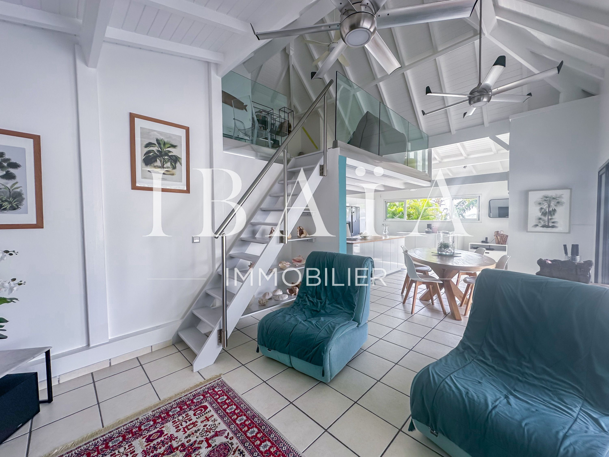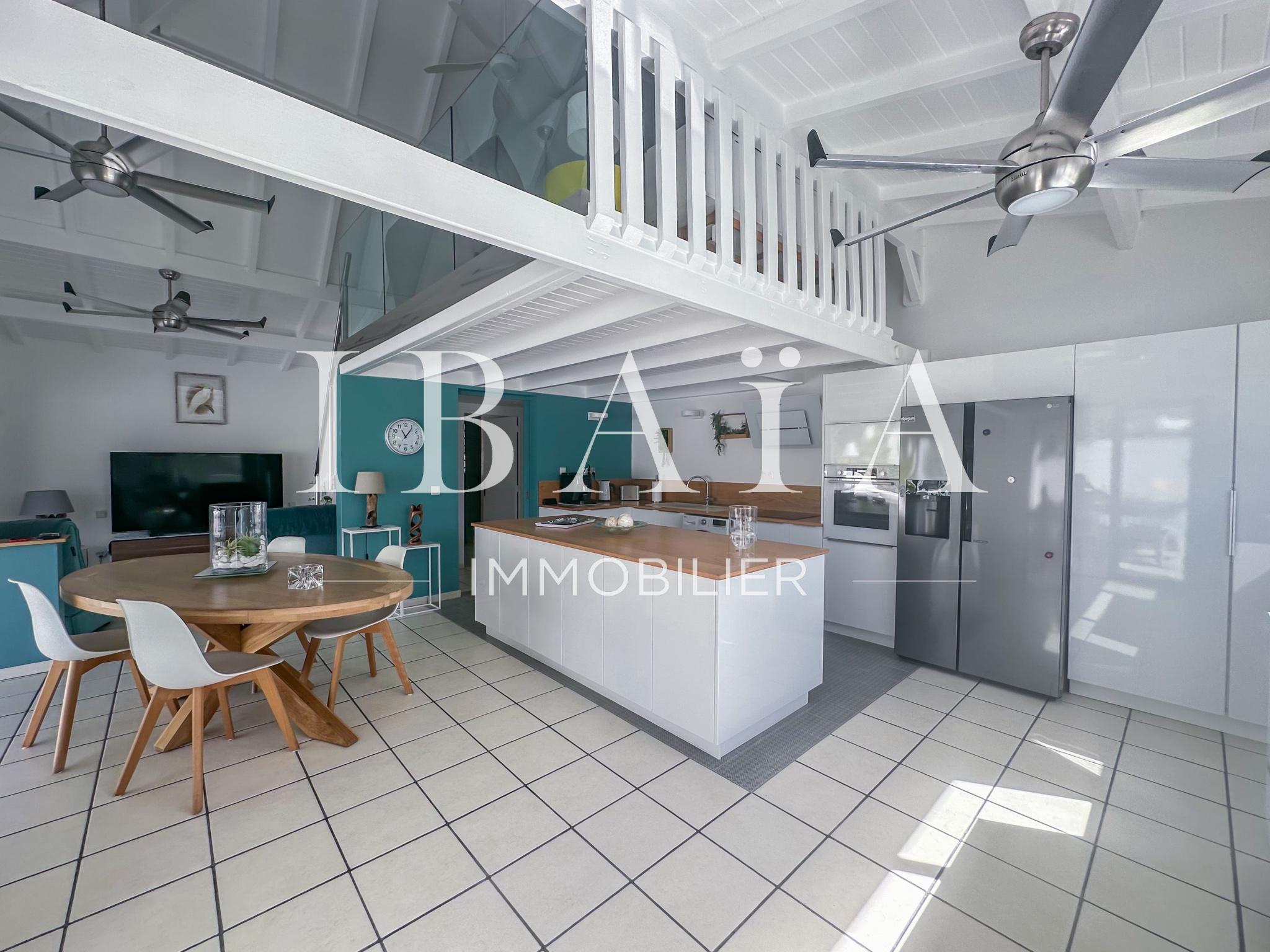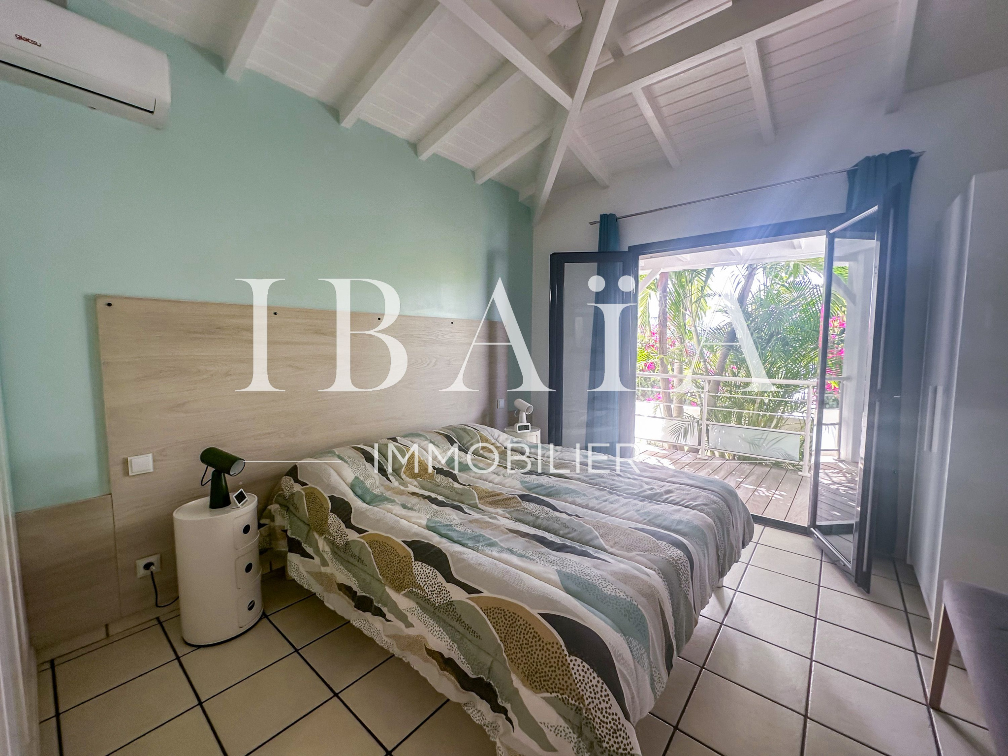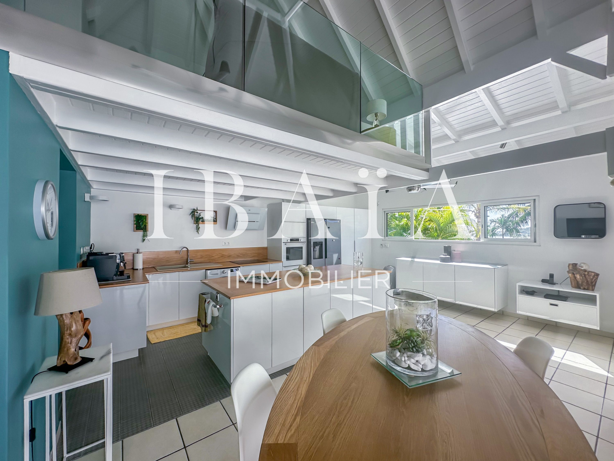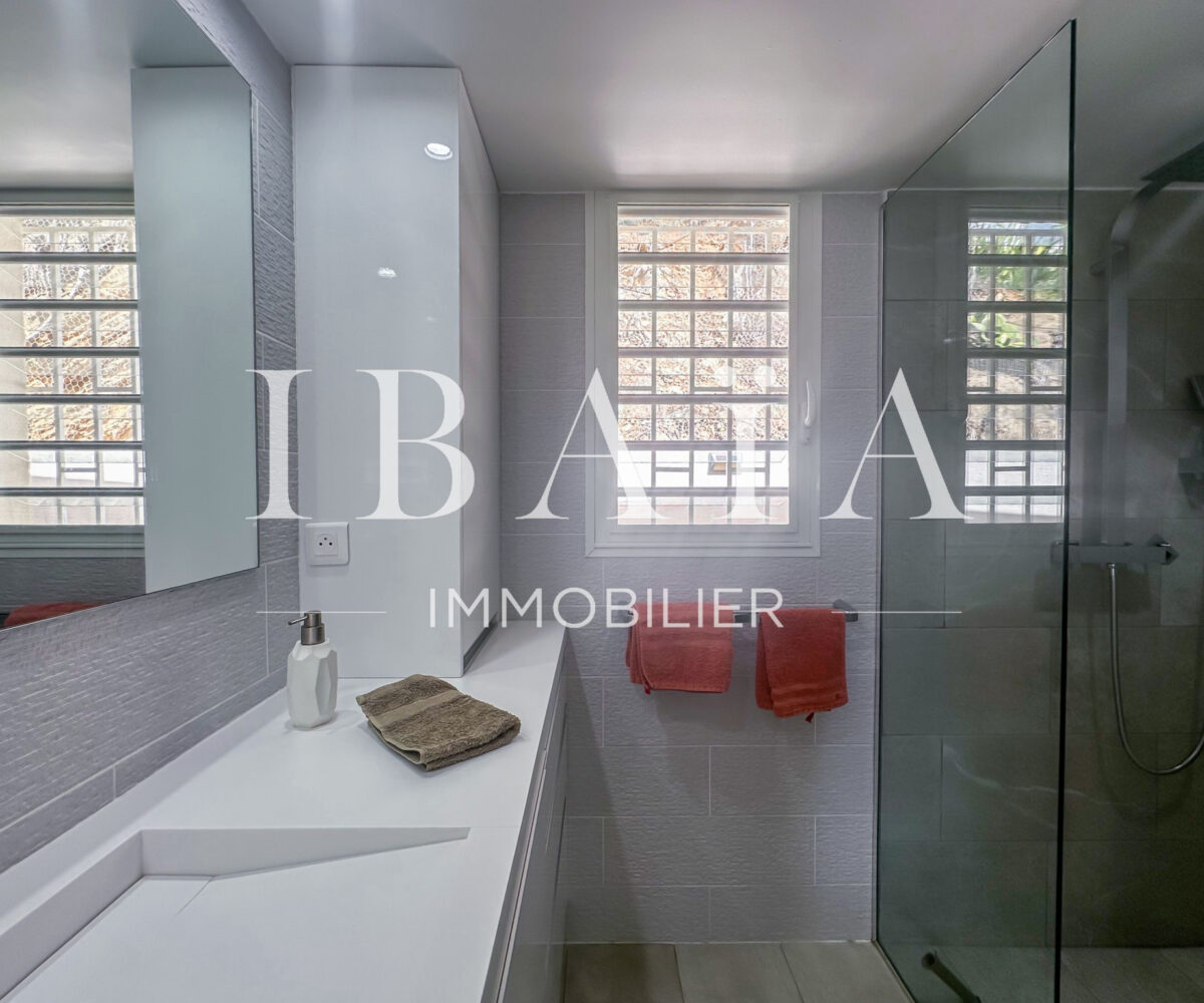 Cette villa d’exception se compose de deux chambres spacieuses. Une troisième pièce, aménagée en mezzanine, est actuellement utilisée comme bureau et dispose d’un canapé-lit, offrant ainsi une grande flexibilité d’utilisation. Le séjour, baigné de lumière, s’ouvre sur une cuisine américaine entièrement aménagée, créant un espace de vie convivial.