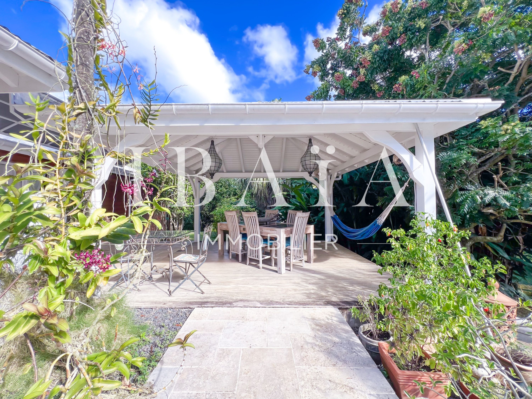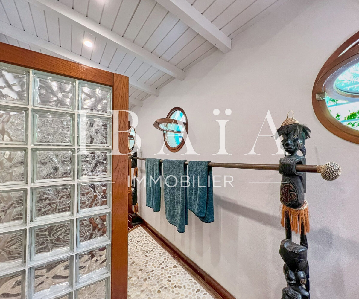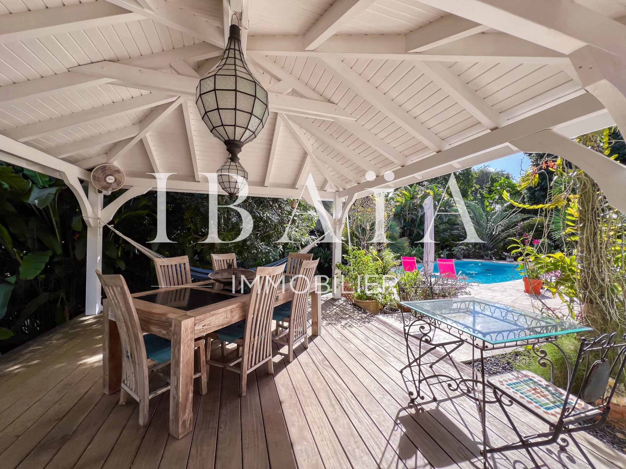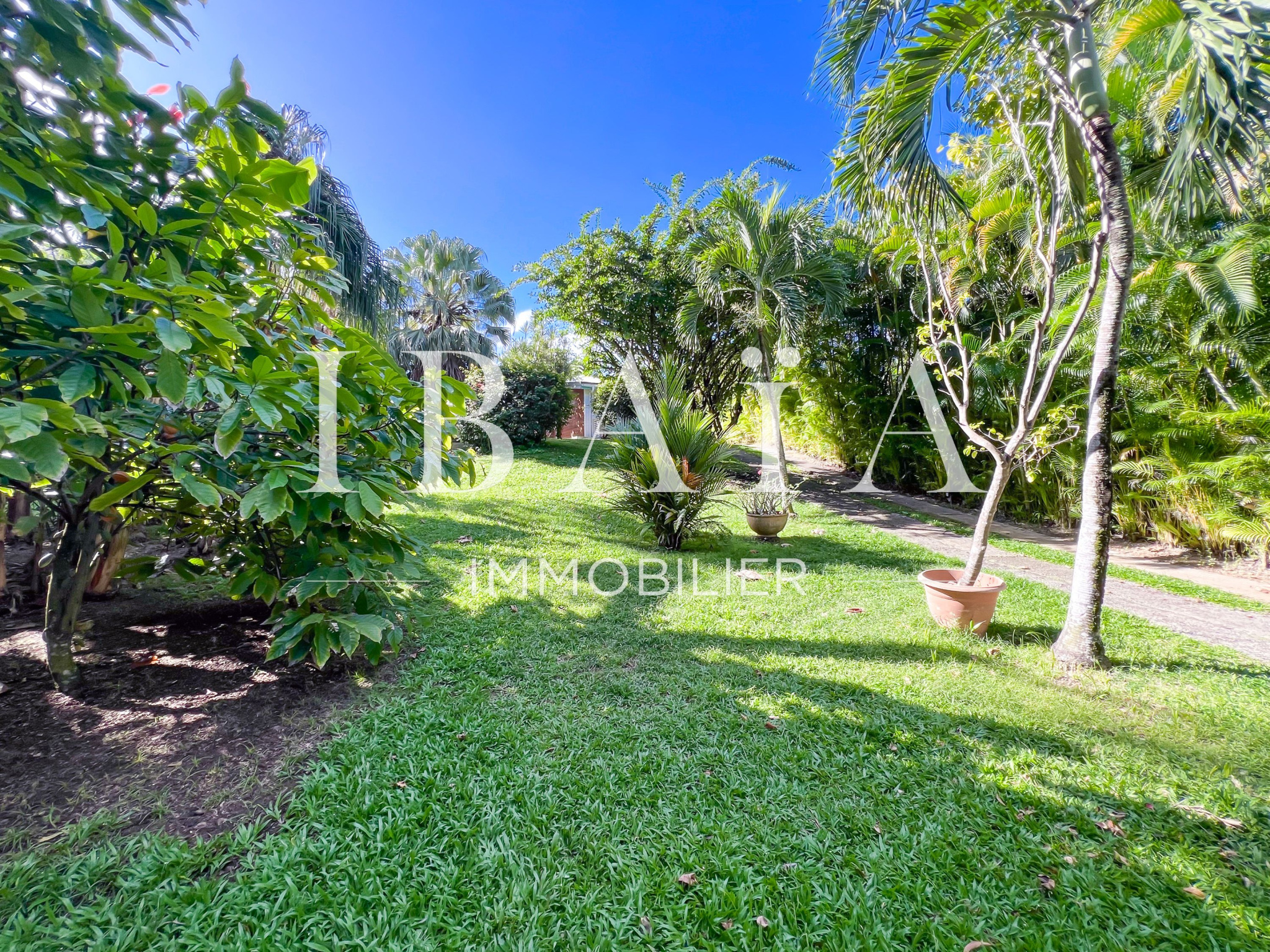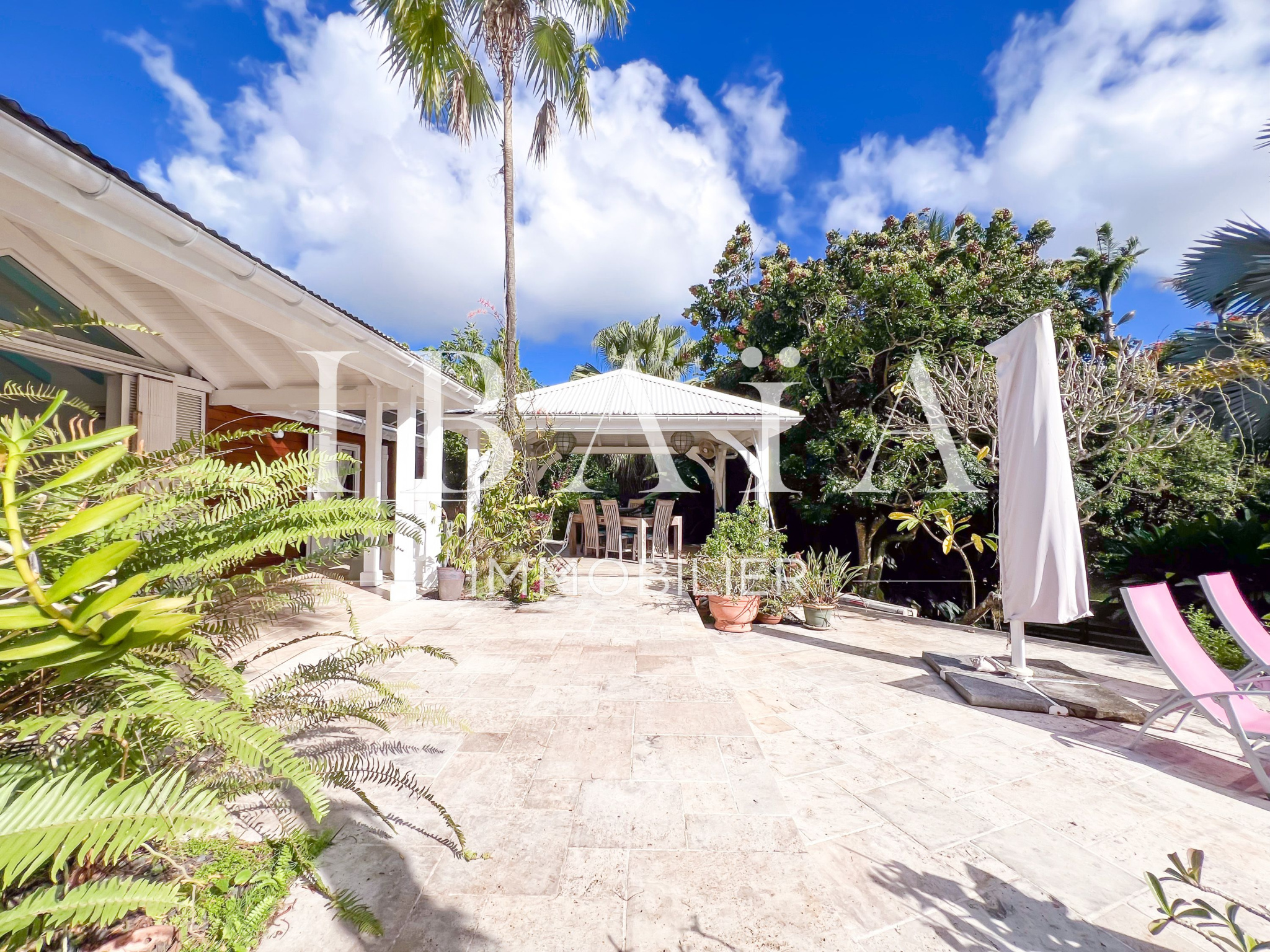 Située sur un terrain arboré d’environ 1 800 m2, cette villa de plain-pied d’une superficie de 151 m2 (hors terrasses et carbet) est en parfait état.