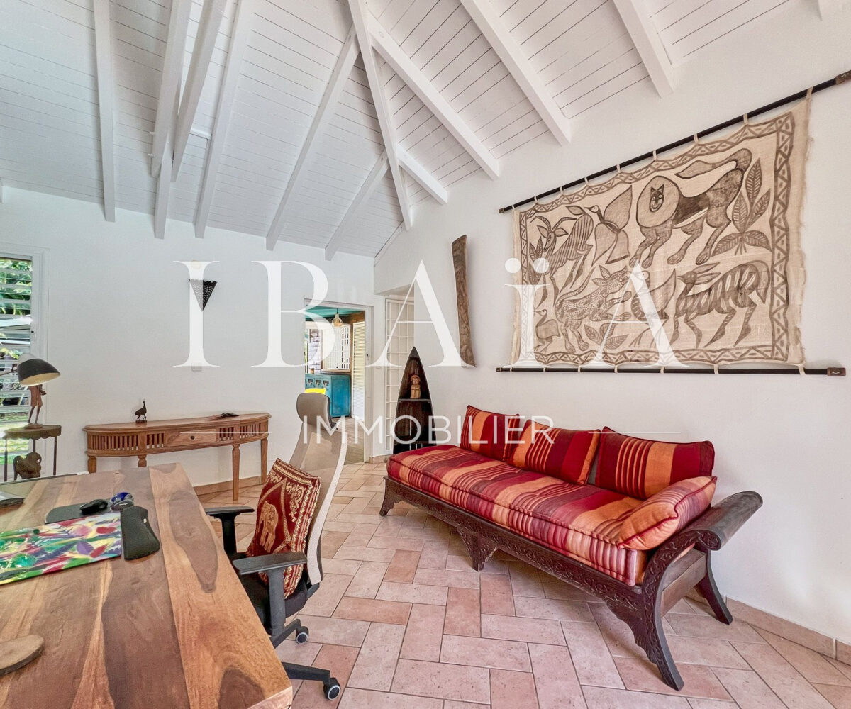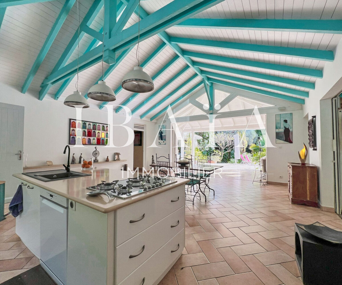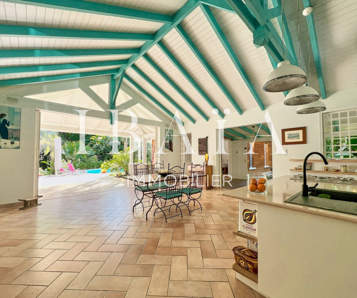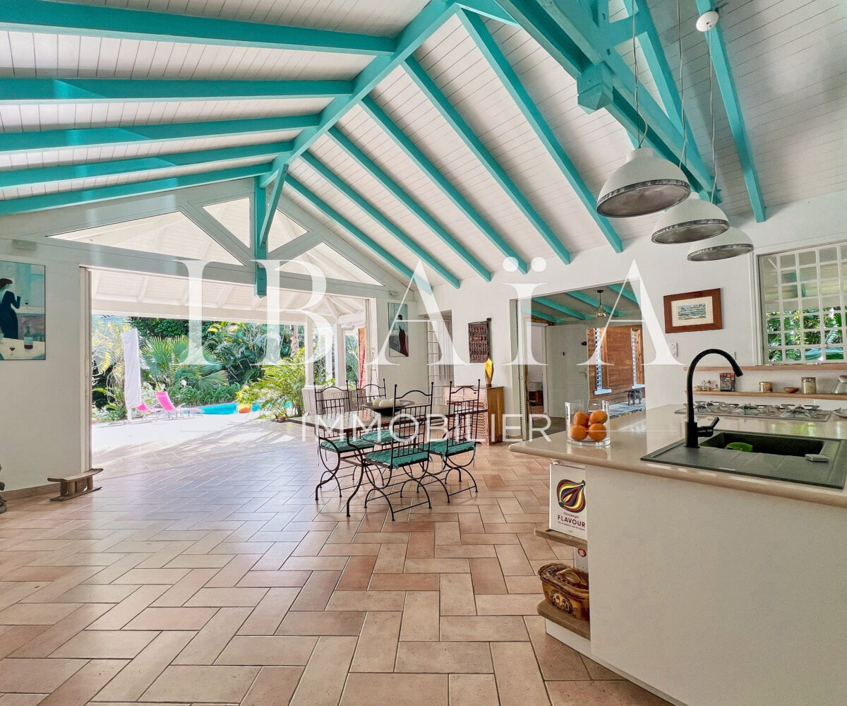 La pièce à vivre s’ouvre sur l’extérieur avec deux terrasses couvertes et un carbet, parfait pour profiter du climat extérieur.