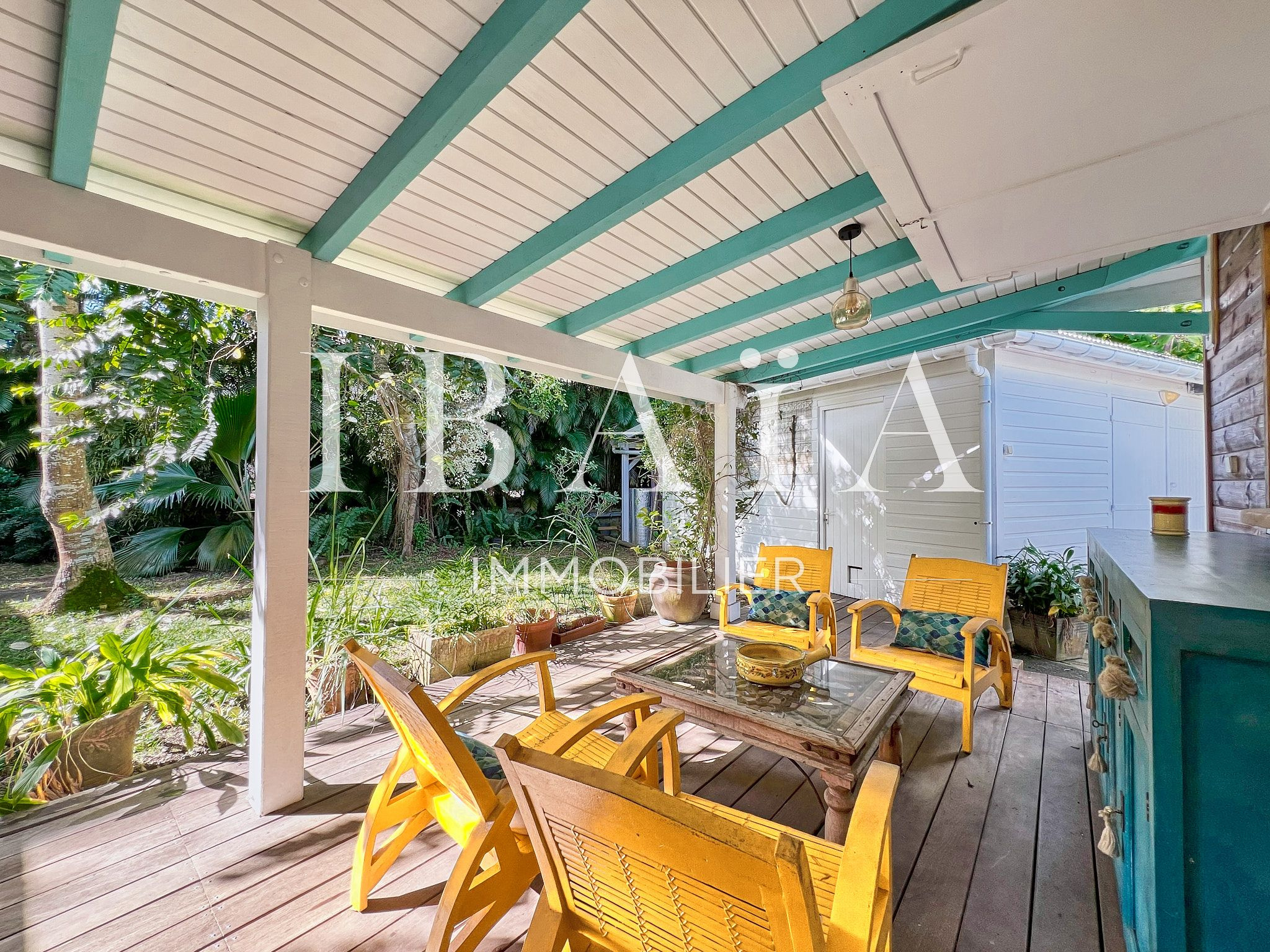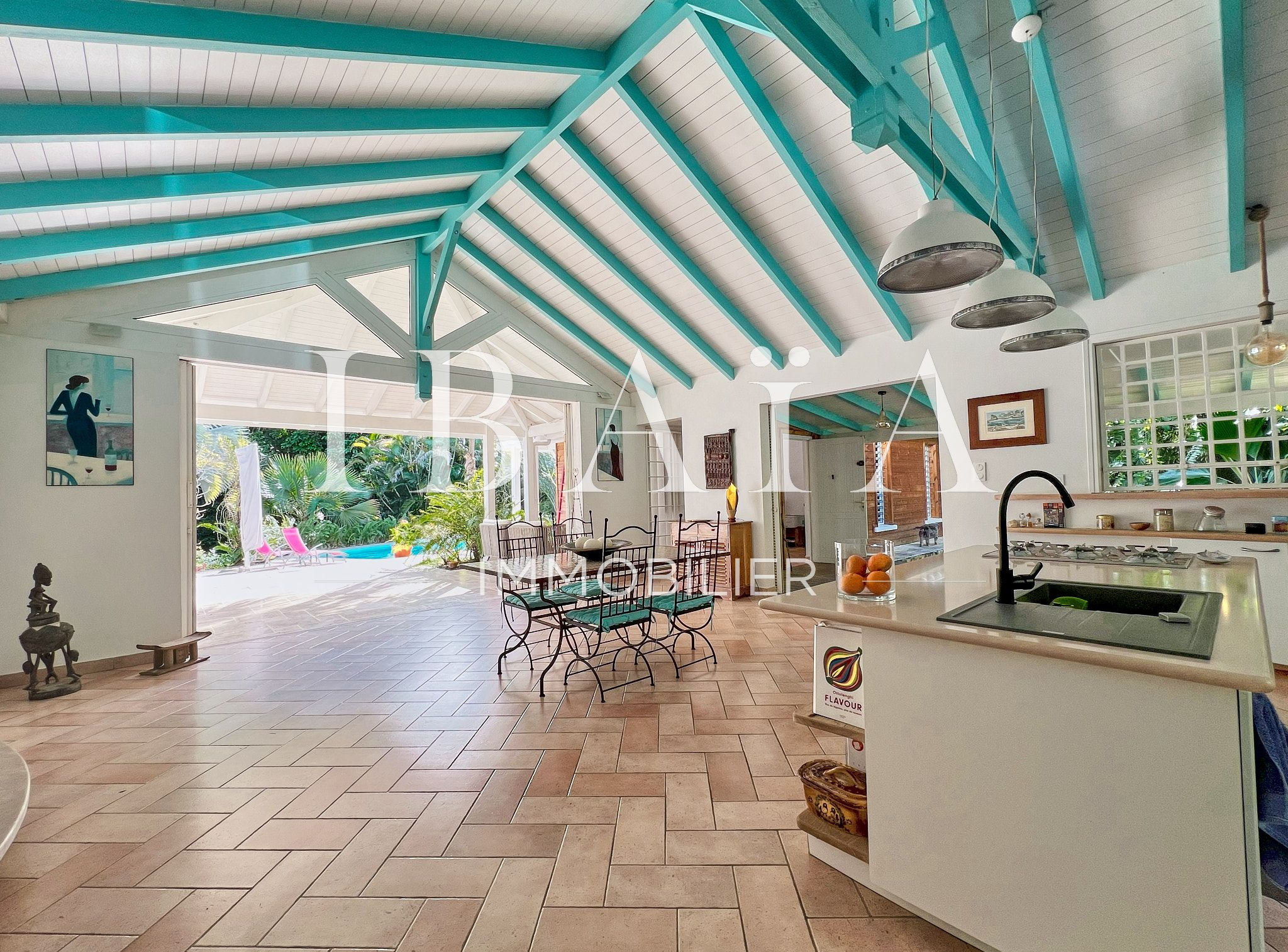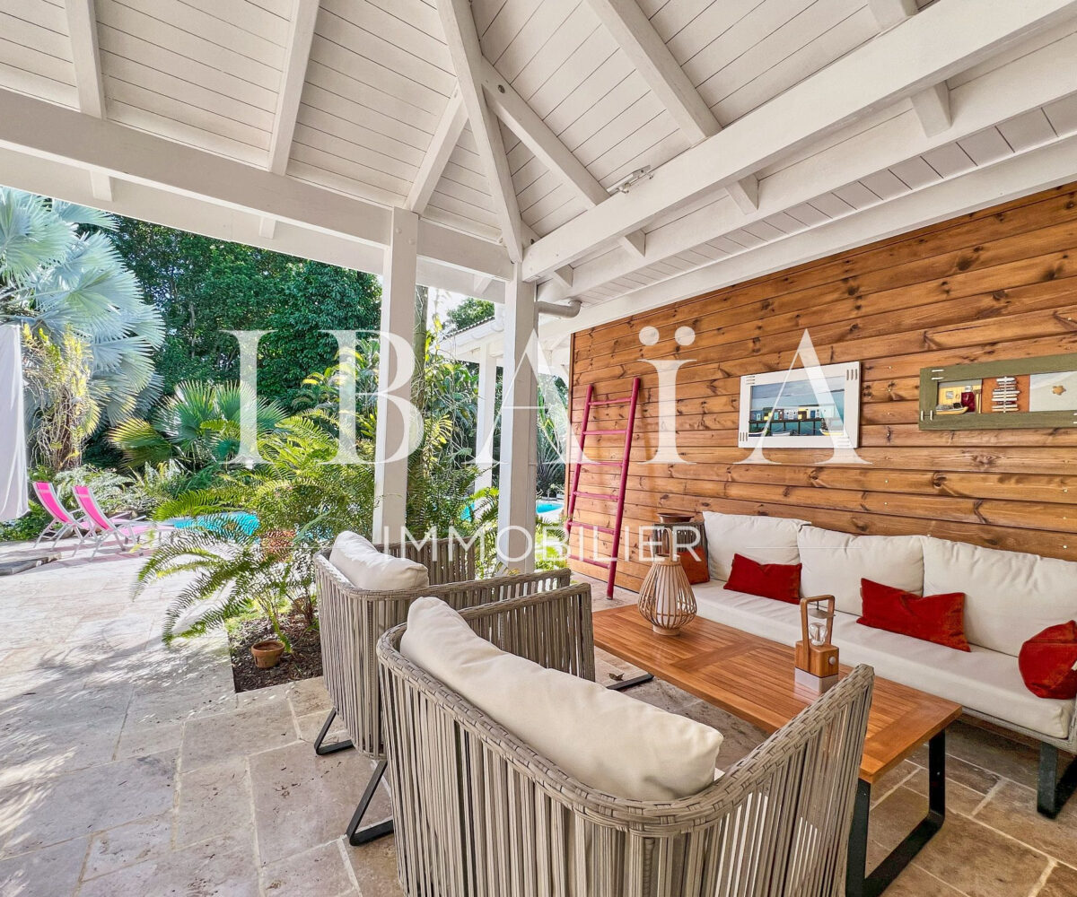 La pièce à vivre s’ouvre sur l’extérieur avec deux terrasses couvertes et un carbet, parfait pour profiter du climat extérieur.