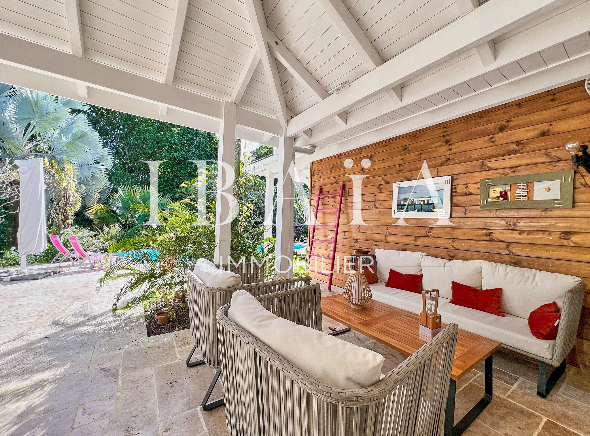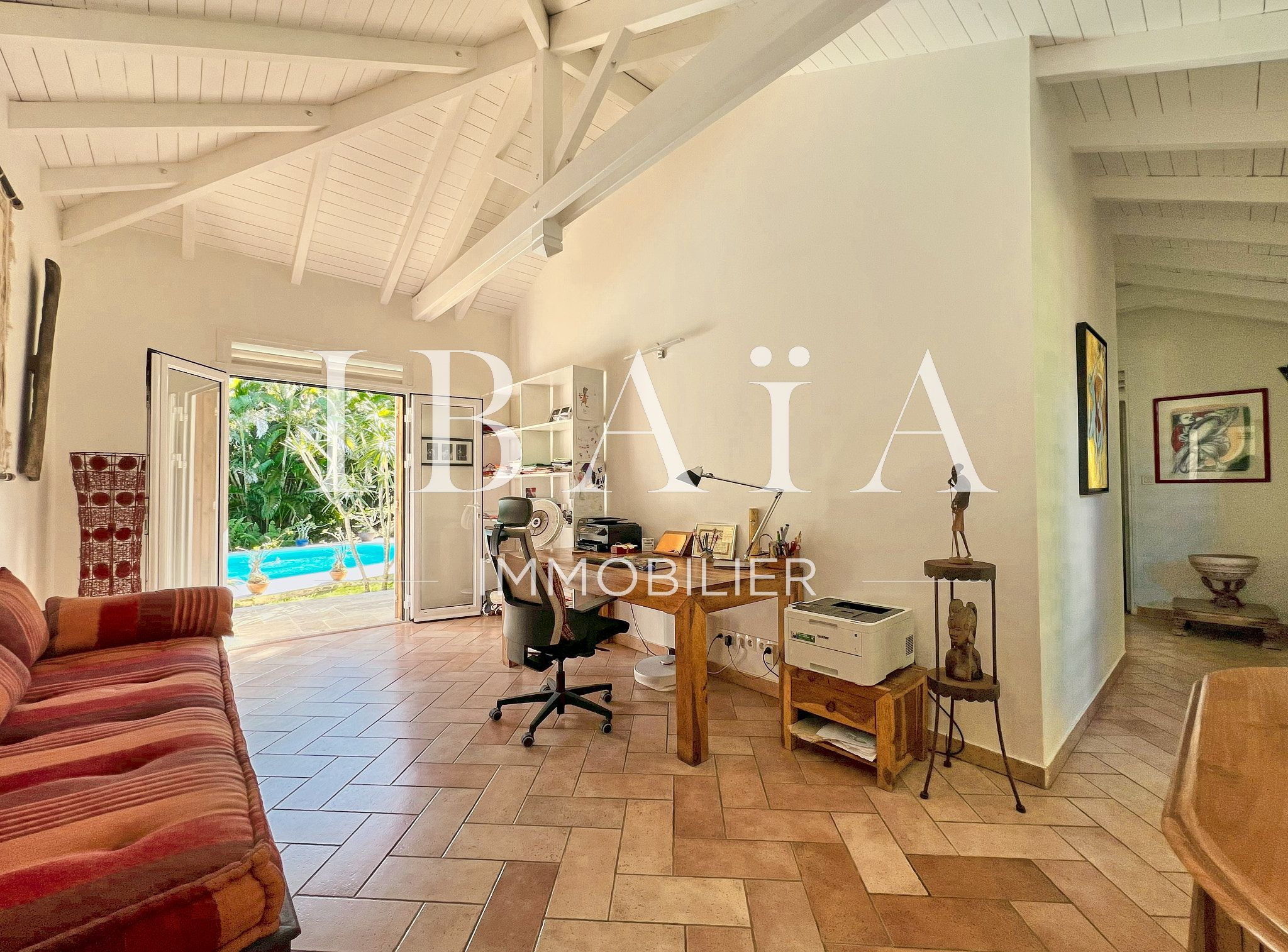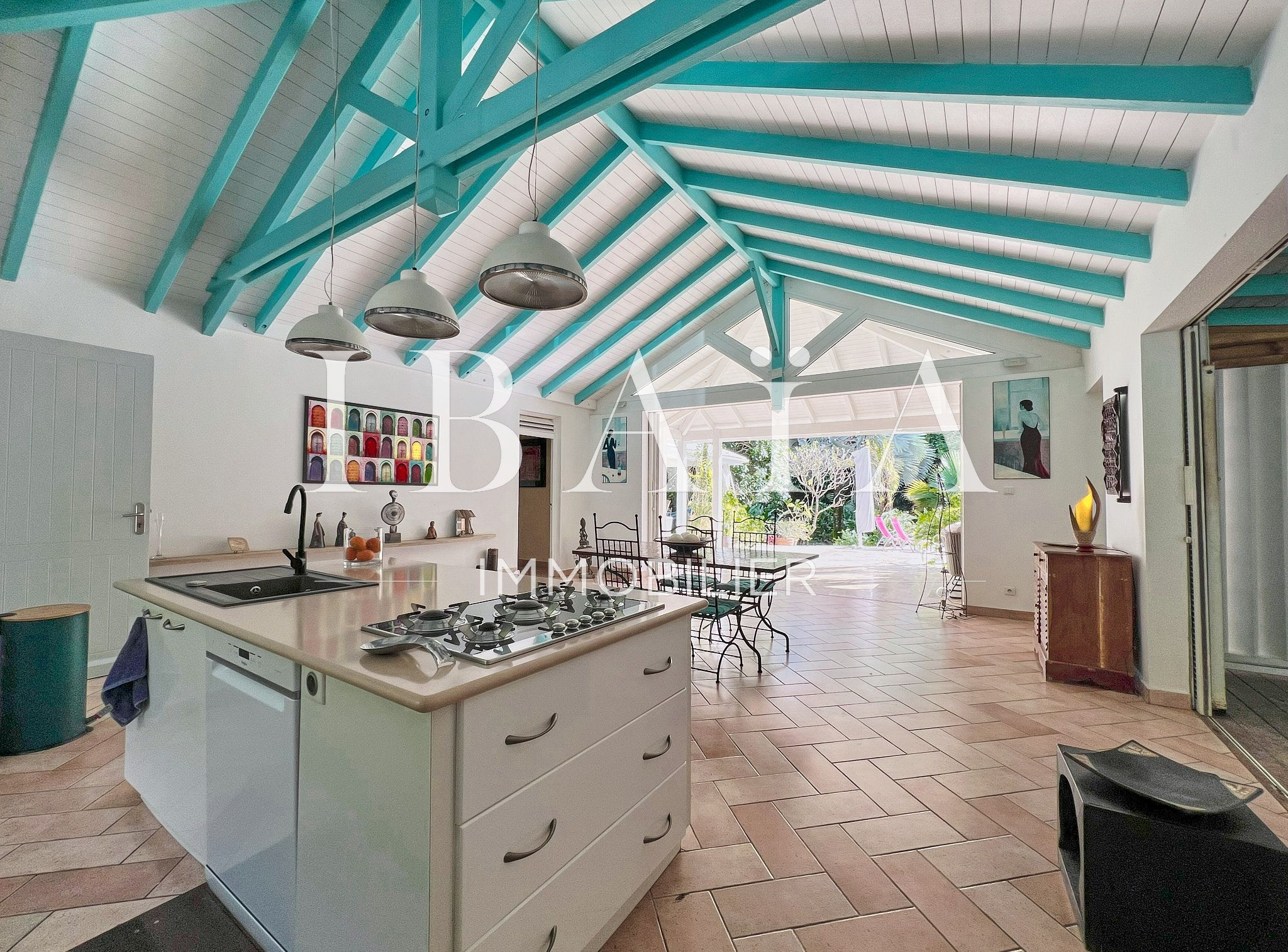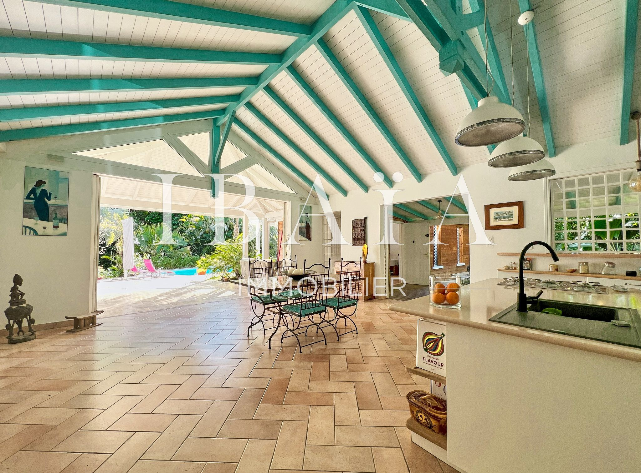 La pièce à vivre s’ouvre sur l’extérieur avec deux terrasses couvertes et un carbet, parfait pour profiter du climat extérieur.
