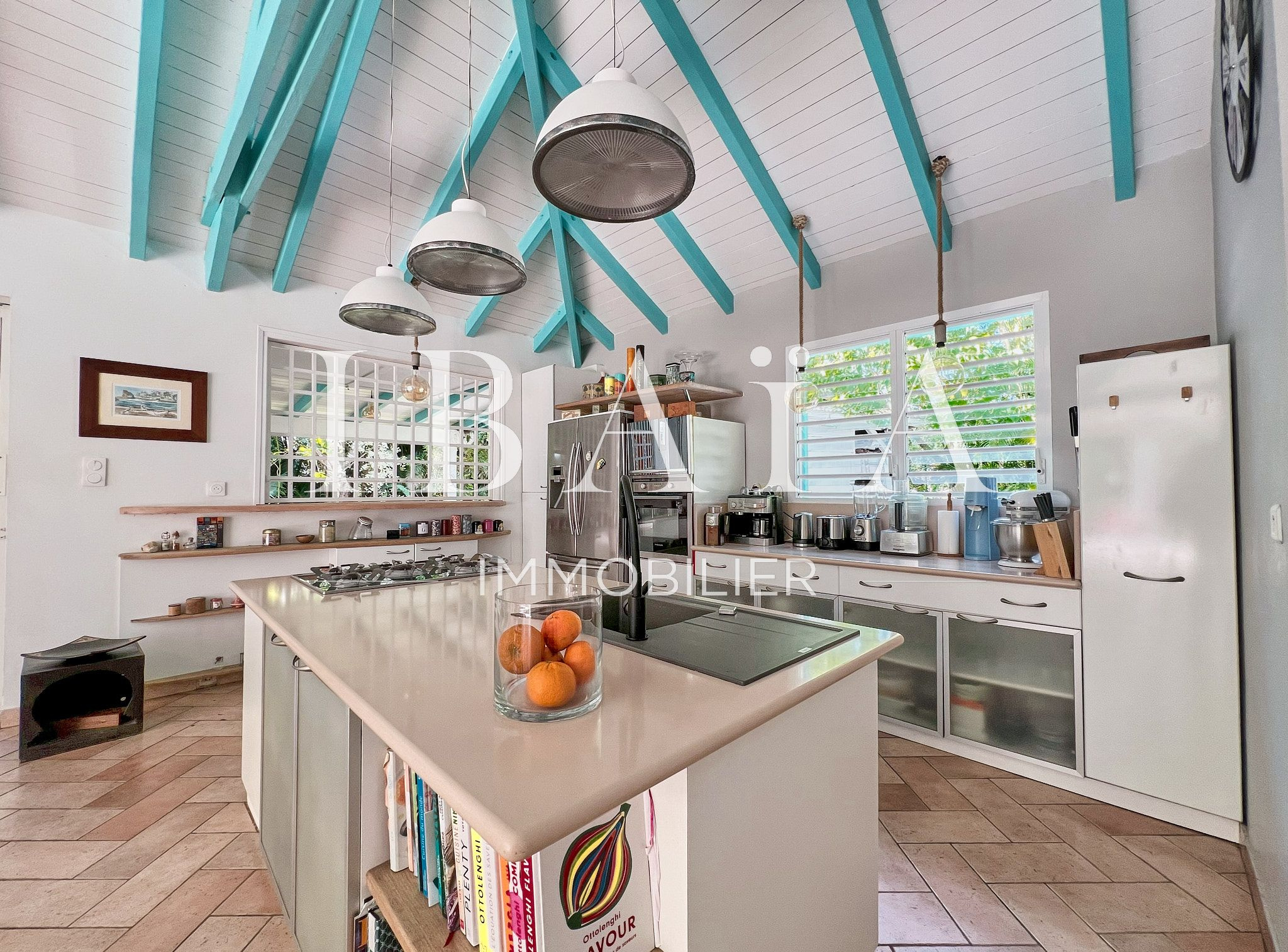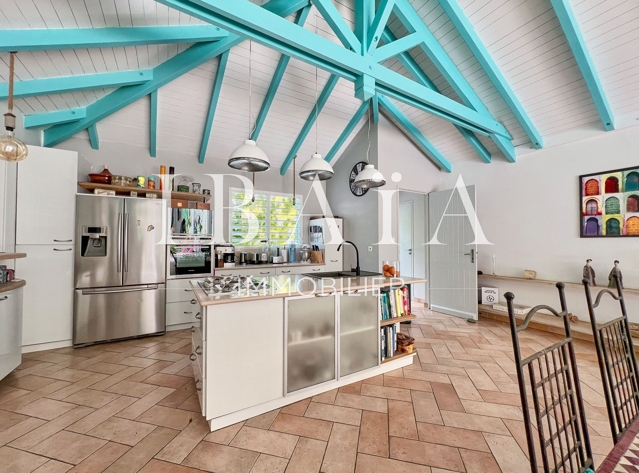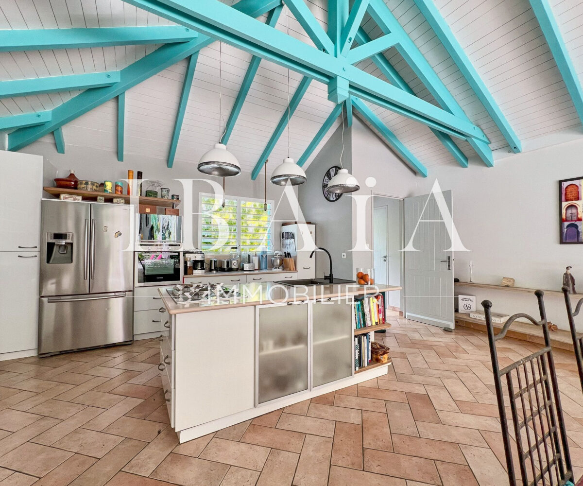 – Une cuisine américaine avec îlot central ouverte sur un vaste séjour, bénéficiant d’une charpente traditionnelle,