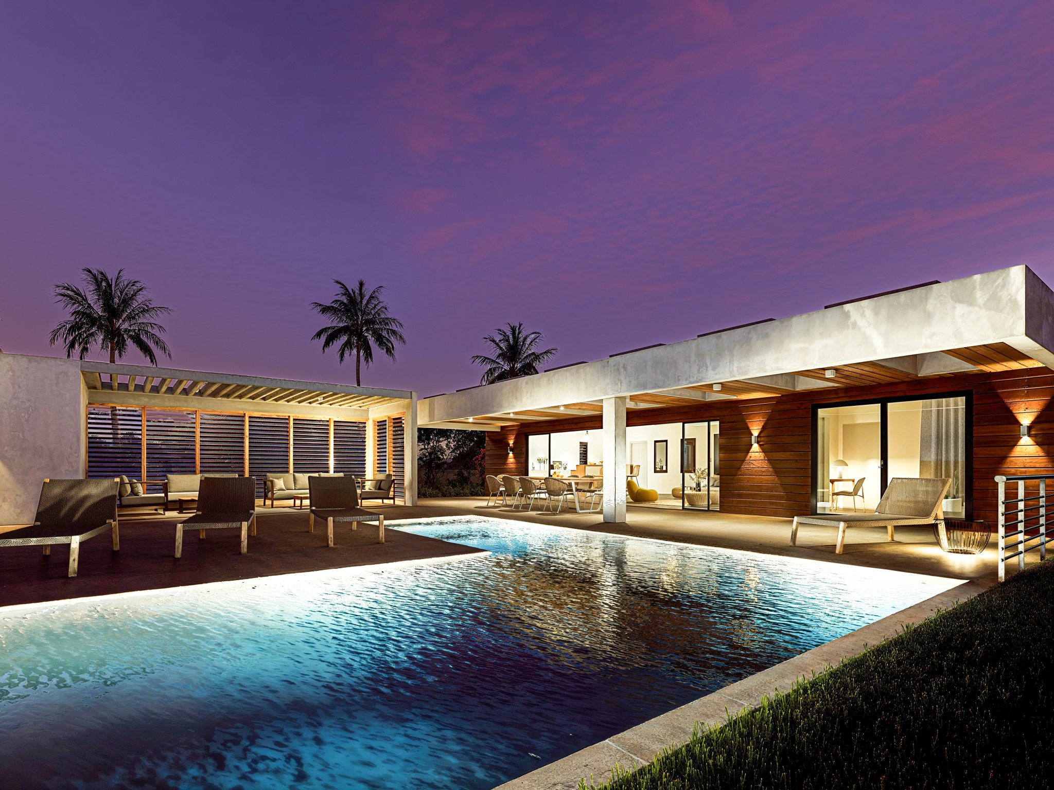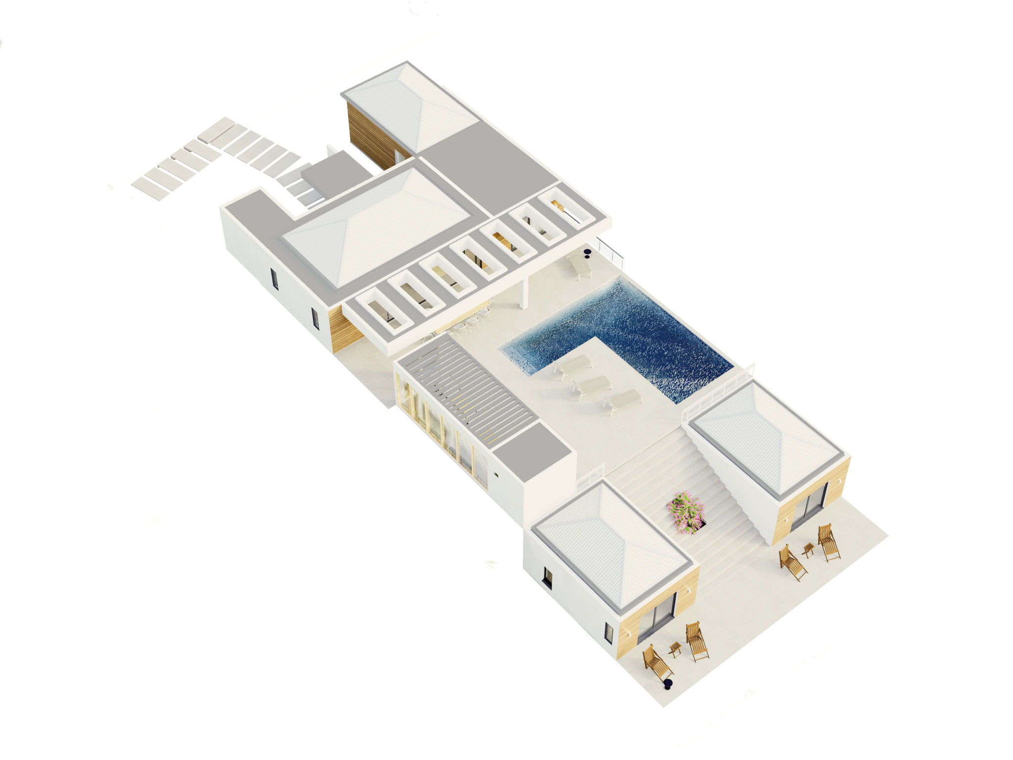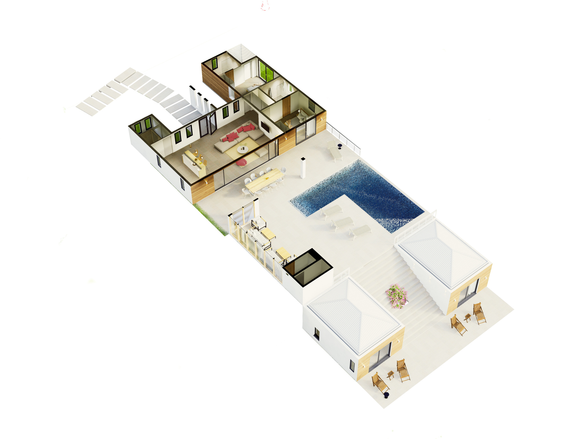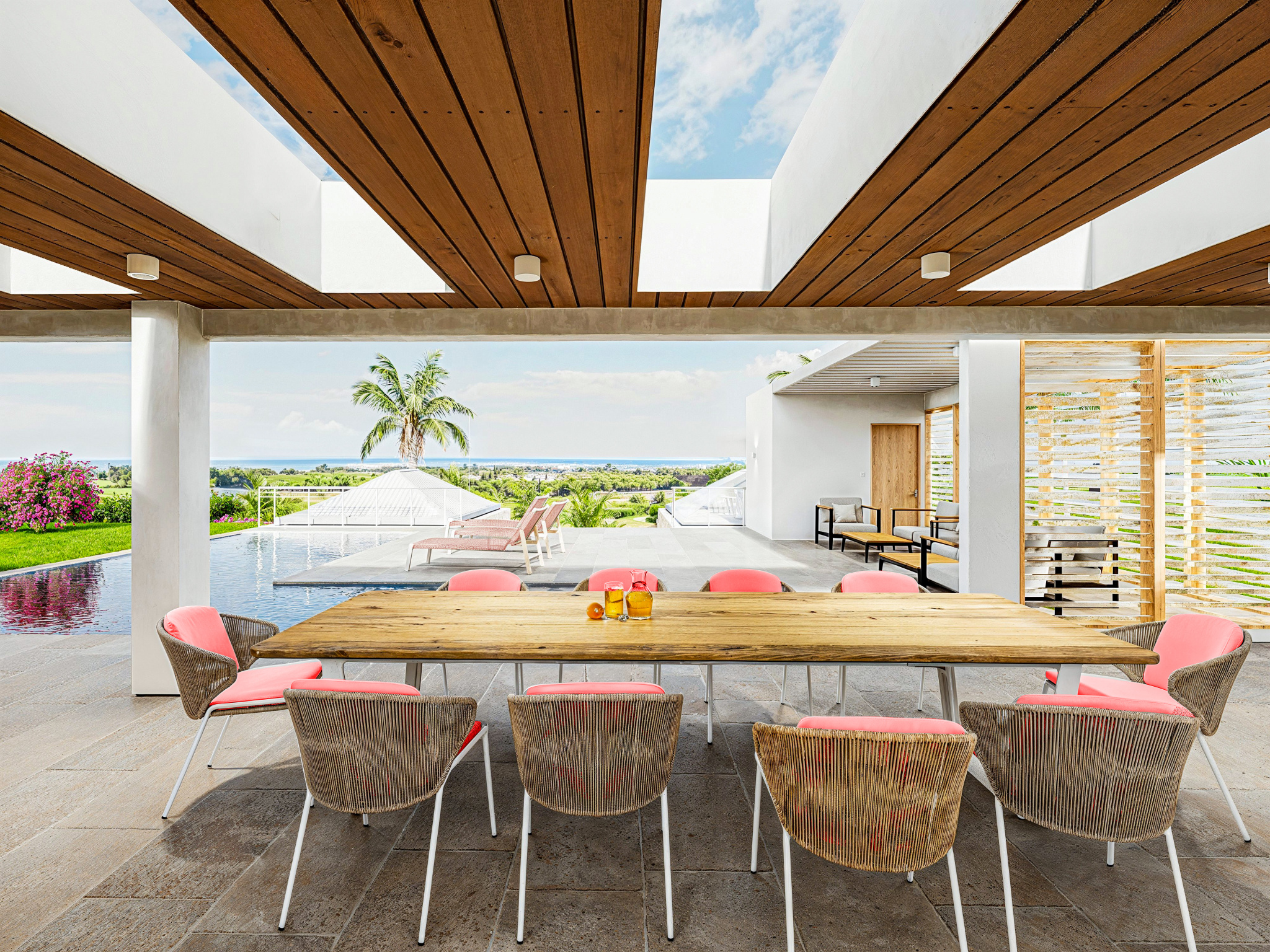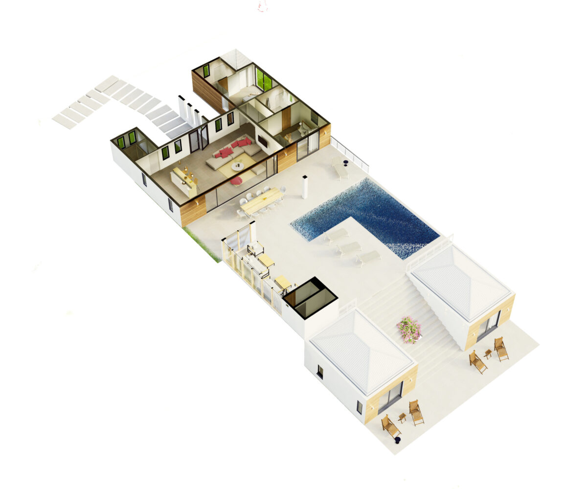 Implantée sur un terrain de 1 083 m2, la villa développe environ 184 m2 d’espaces intérieurs lumineux. Dès l’entrée, on découvre des volumes généreux : un séjour cathédrale ouvert sur une large terrasse couverte, une piscine harmonieusement intégrée au jardin, ainsi qu’une cuisine américaine moderne et entièrement aménagée, idéale pour recevoir.