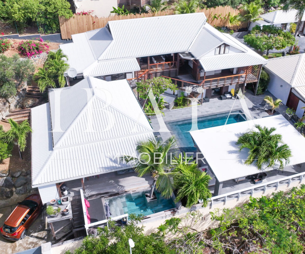 Très bien ventilée, cette propriété comprend une villa principale de 2 master bedrooms et un bureau, qui peut aisément être converti en chambre supplémentaire avec salle de bain, les arrivées d’eau étant déjà installées. La cuisine américaine, accompagnée d’un cellier, s’ouvre sur un séjour et un salon lumineux offrant une vue imprenable sur la mer.