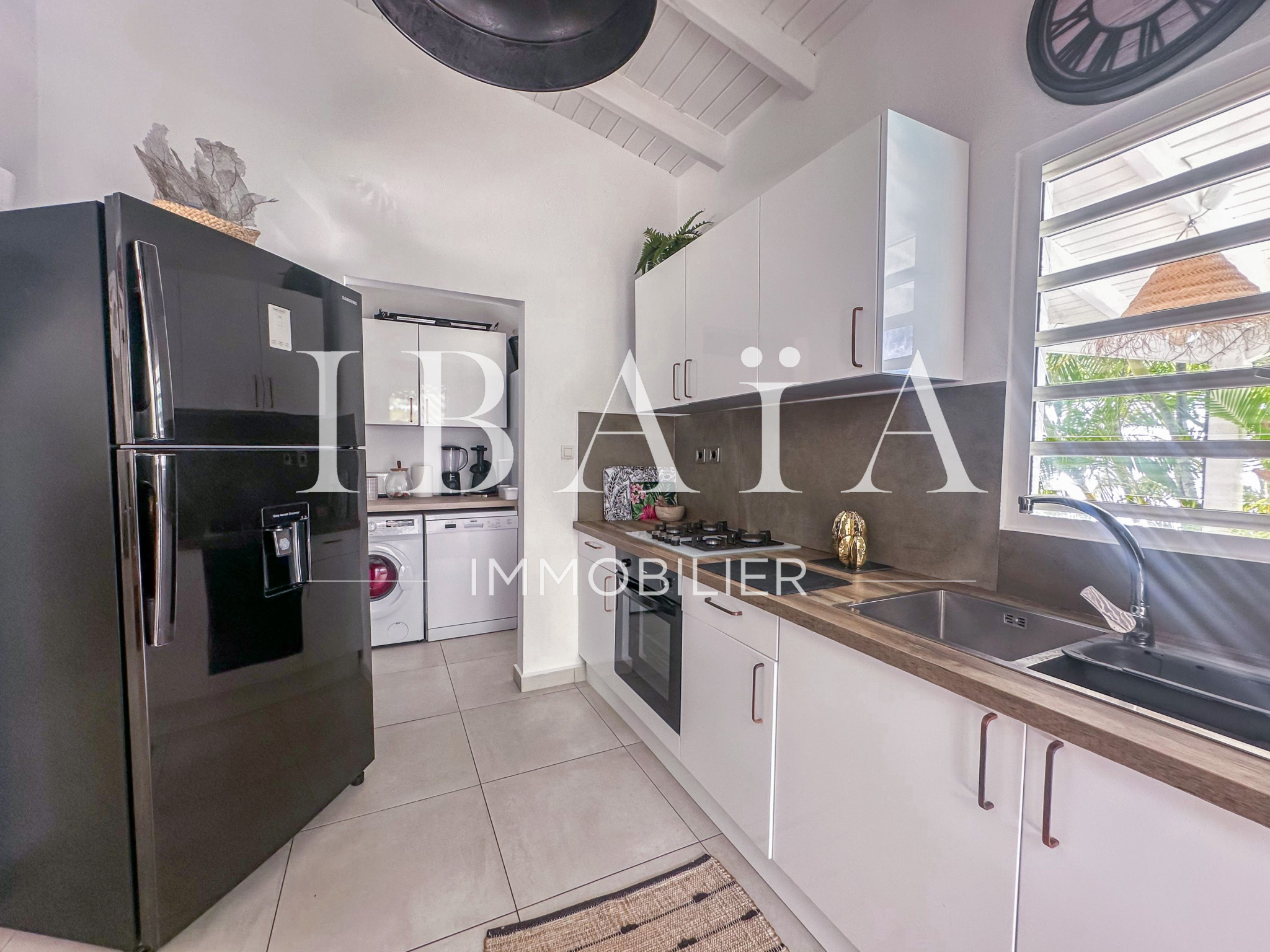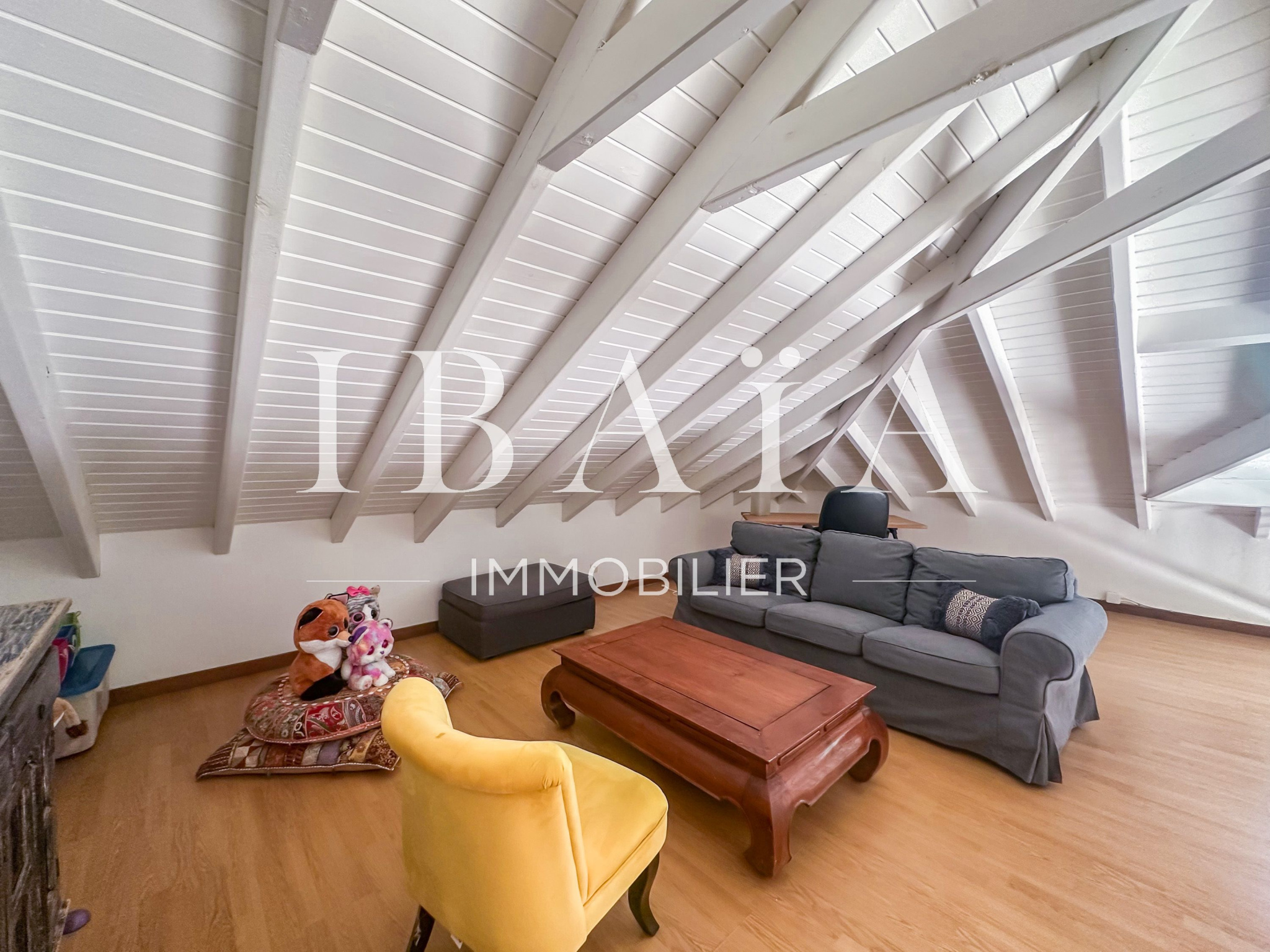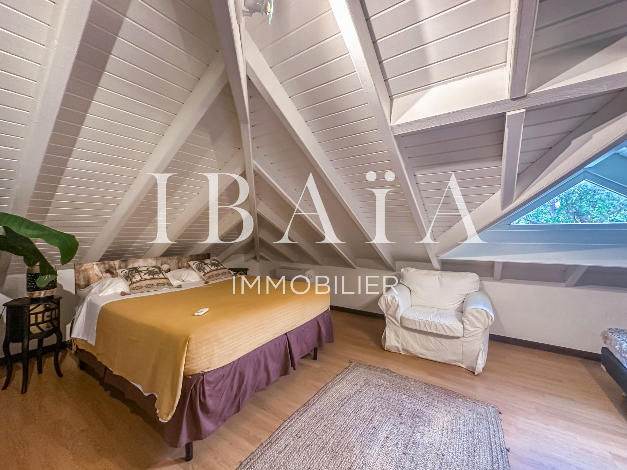 À l’intérieur, la villa séduit par sa cuisine américaine fonctionnelle avec cellier, ouverte sur un séjour lumineux doté d’un superbe toit cathédrale, offrant une sensation d’espace et de volume remarquable.