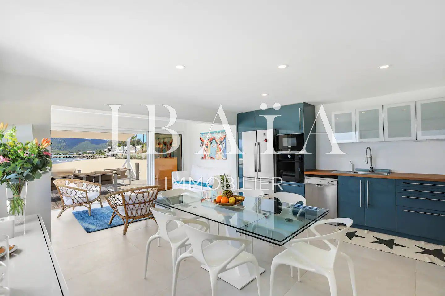 Il se compose d’une entrée, d’une cuisine américaine entièrement équipée, d’un séjour ouvert sur une grande terrasse offrant une vue dégagée sur la plage, ainsi que de trois chambres, chacune disposant de sa propre salle d’eau et de WC.