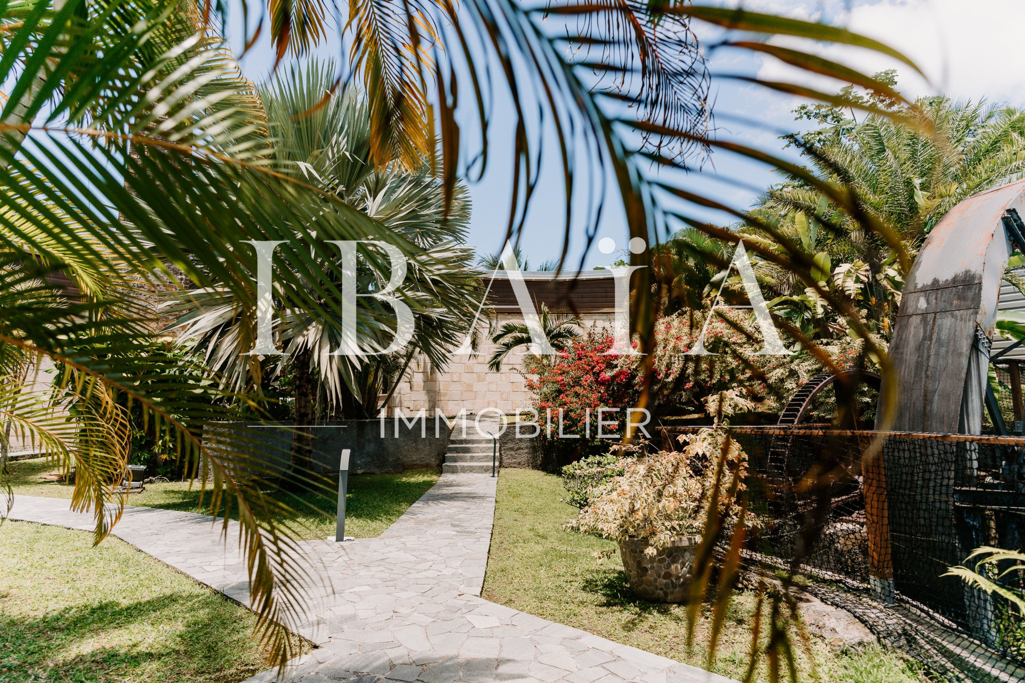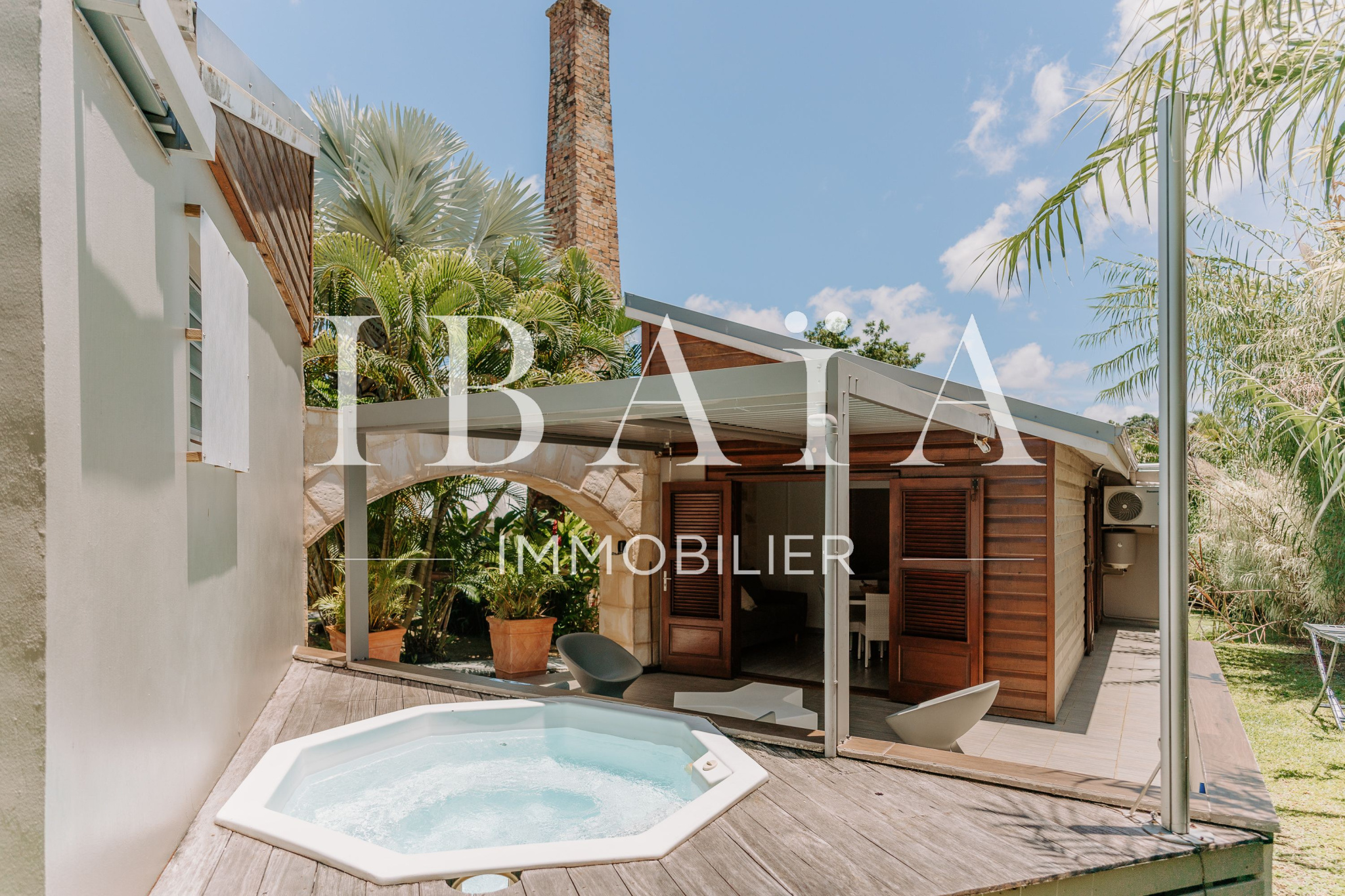 Ce domaine unique s’étend au sein d’un jardin tropical luxuriant, où les vestiges d’une ancienne distillerie témoignent du riche passé de la propriété.