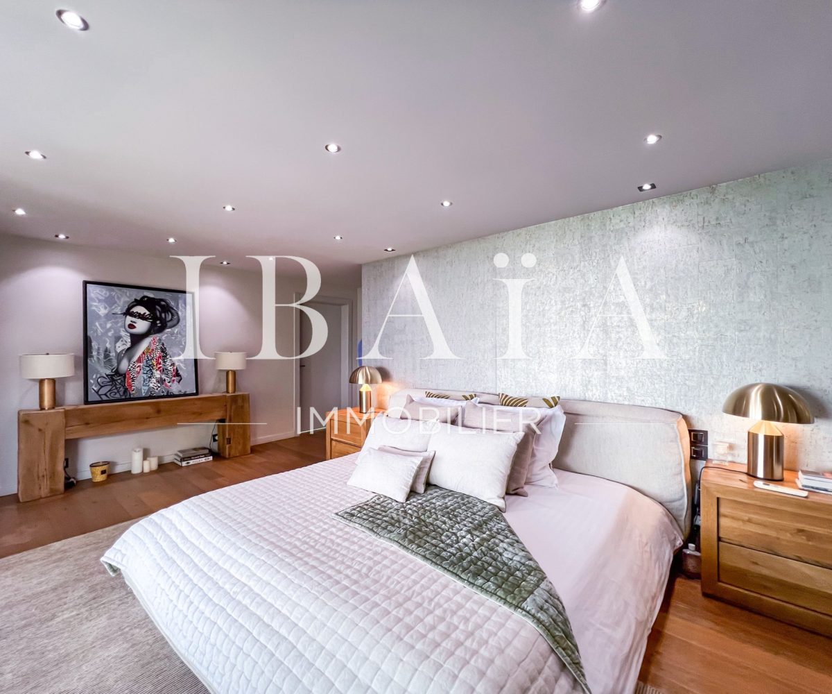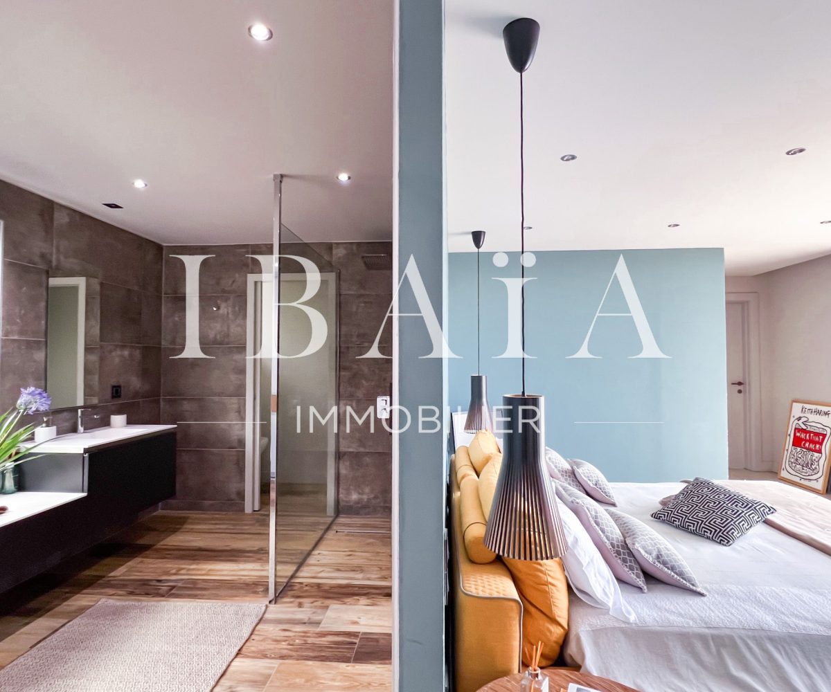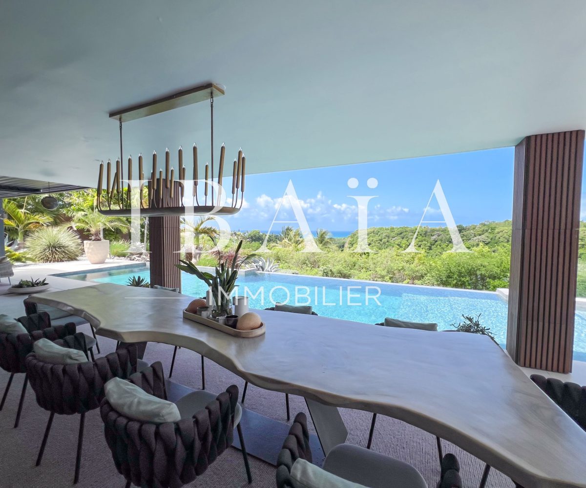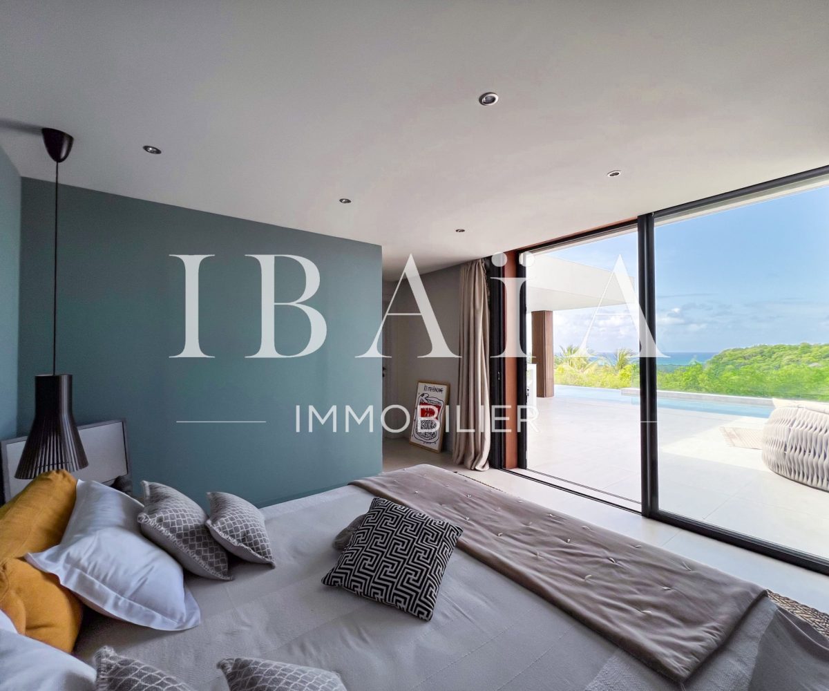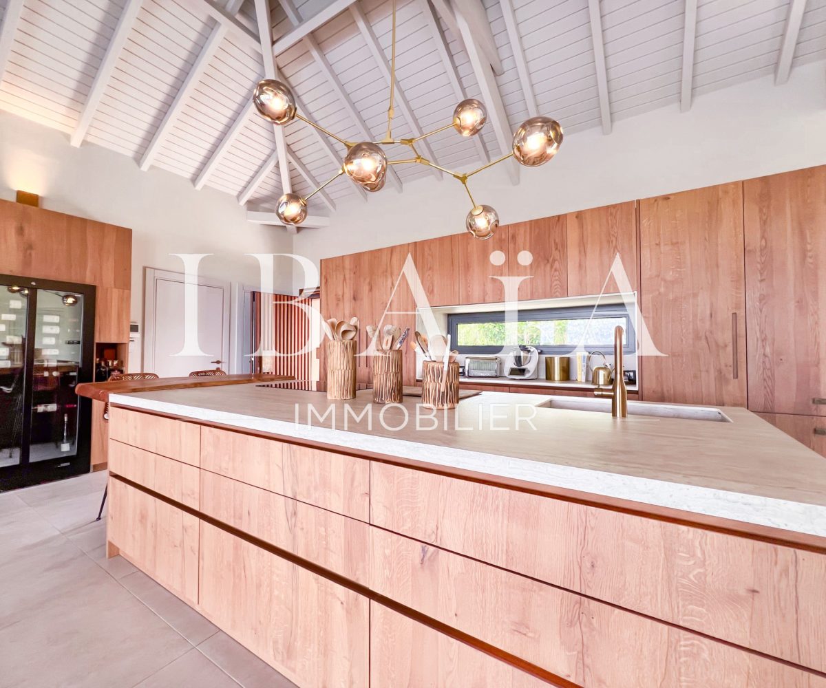 IBAÏA IMMOBILIER a le privilège de vous proposer à la vente cette somptueuse villa d’architecte d’environ 270 mètres carrés, vendue entièrement meublée, et bénéficiant d’une vue imprenable sur la mer et un environnement verdoyant.
