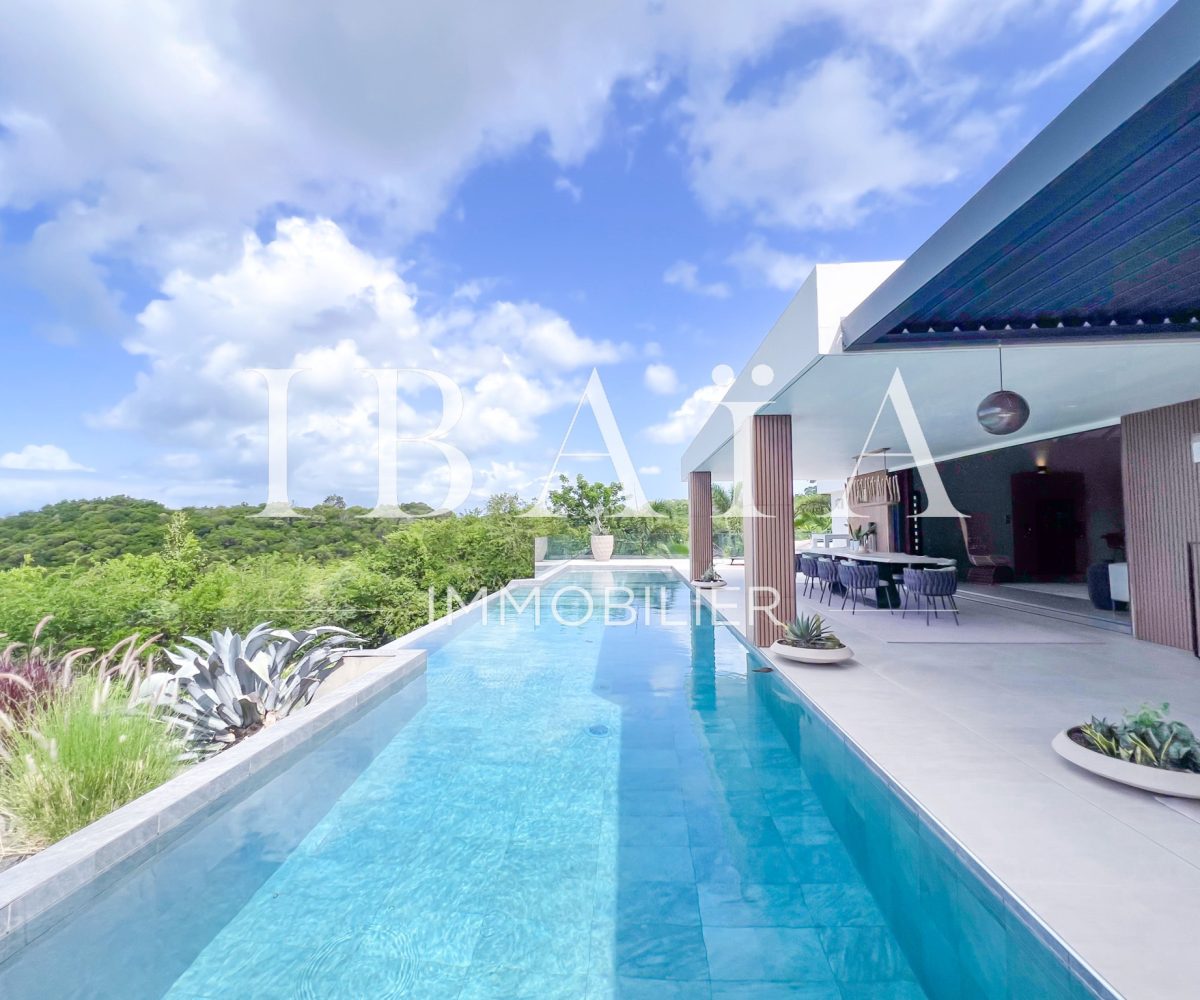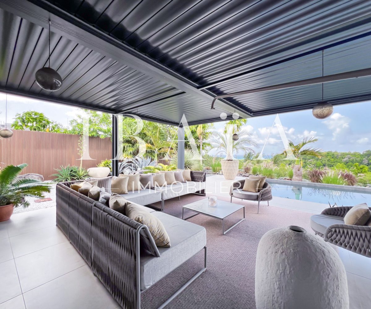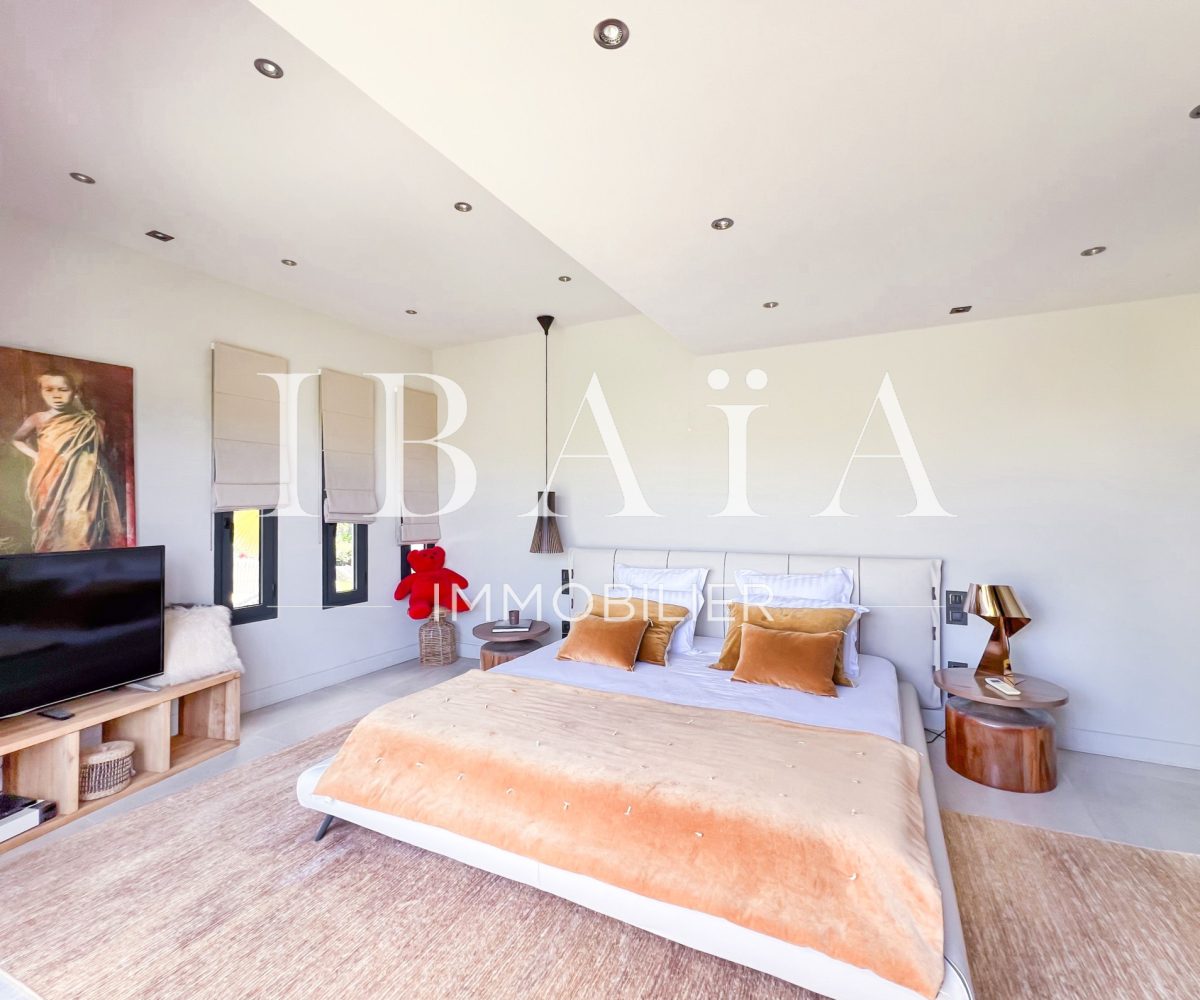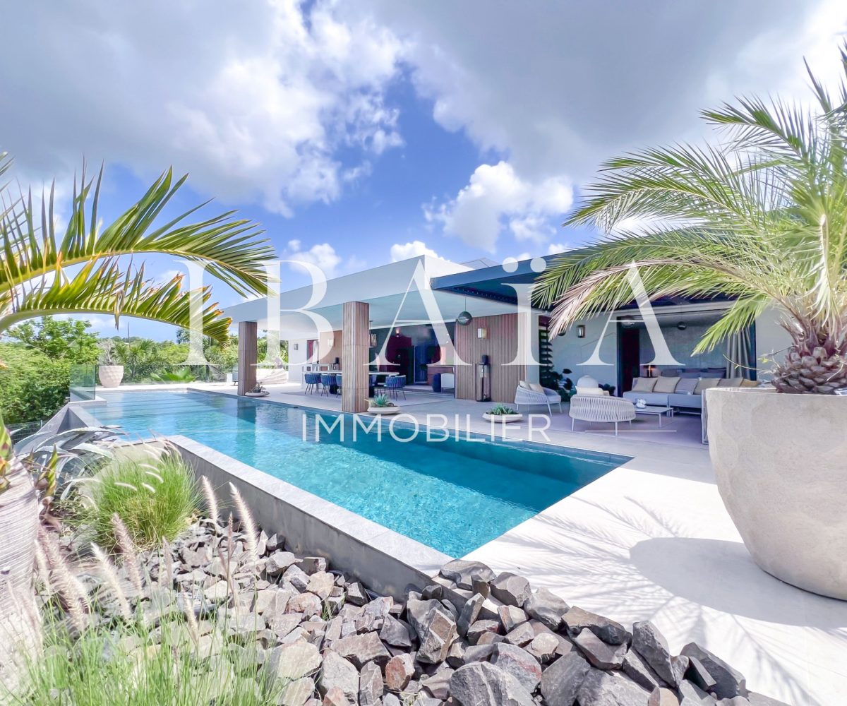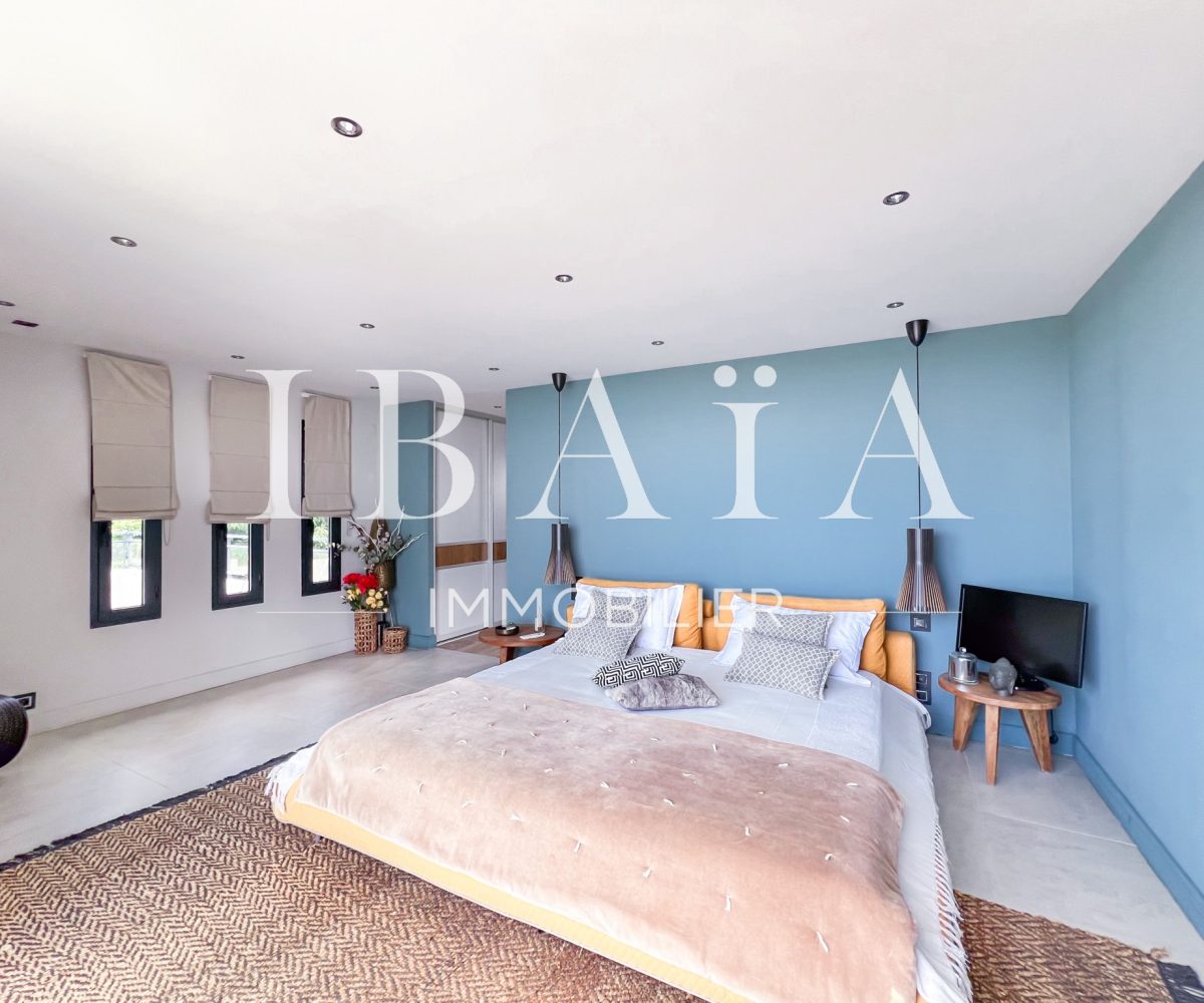 IBAÏA IMMOBILIER a le privilège de vous proposer à la vente cette somptueuse villa d’architecte d’environ 270 mètres carrés, vendue entièrement meublée, et bénéficiant d’une vue imprenable sur la mer et un environnement verdoyant.