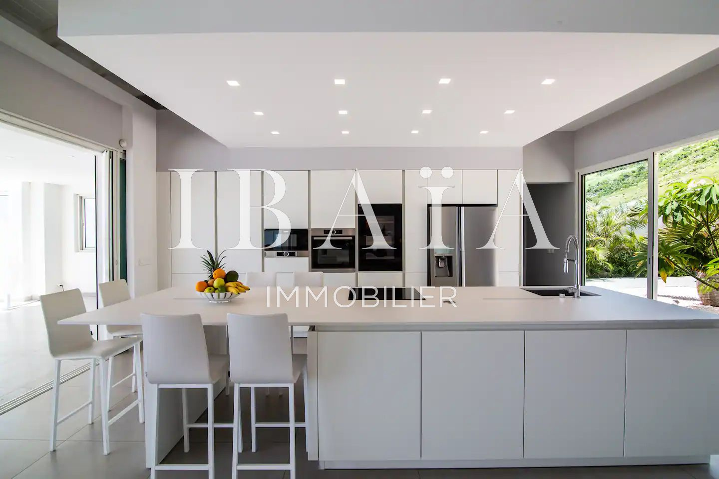 Les espaces de vie se composent d’un vaste salon baigné de lumière naturelle et d’une cuisine sur mesure, équipée d’électroménager haut de gamme : cave à vin, deux fours, réfrigérateur américain, et plaque à induction.