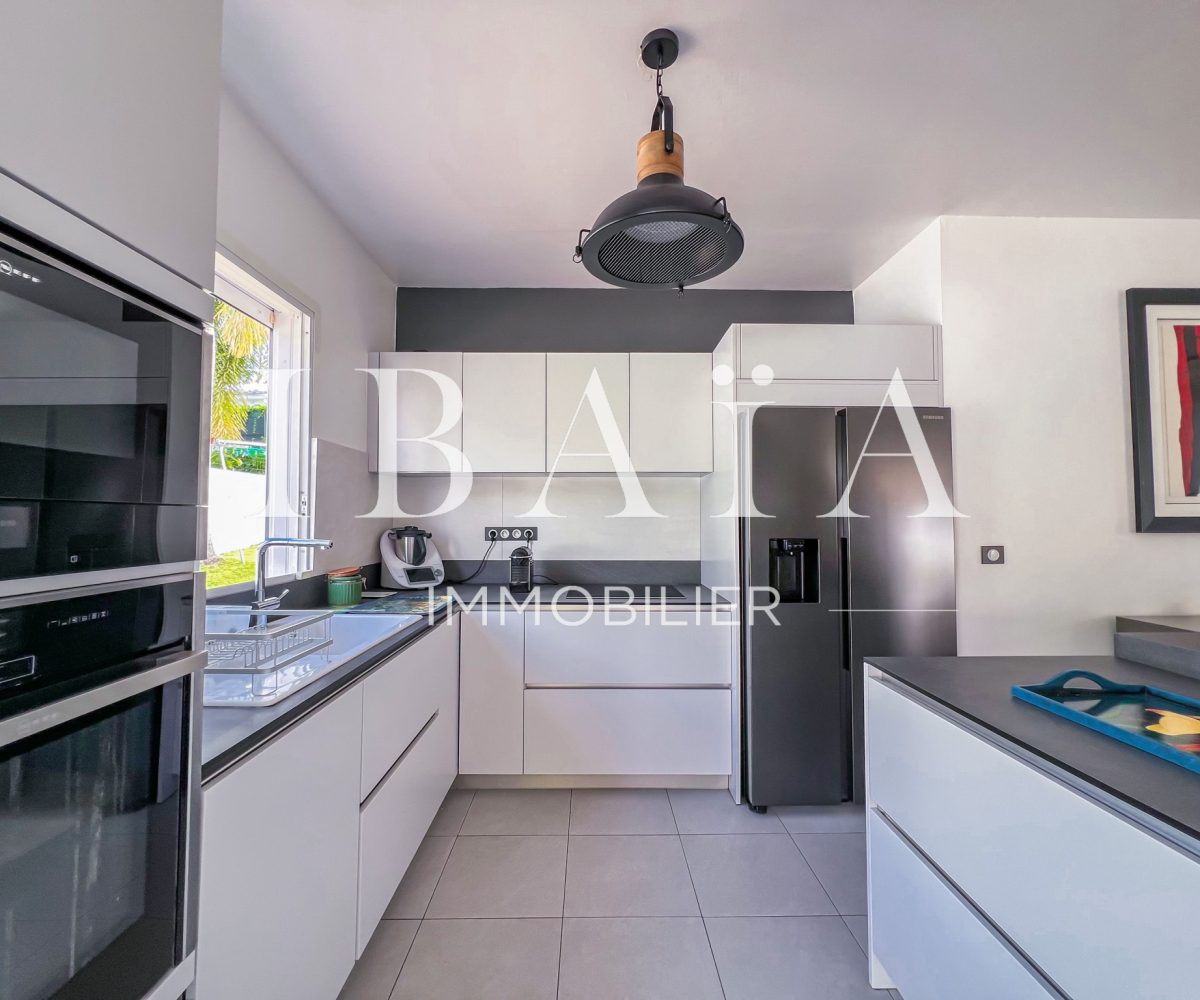 Elle se compose comme suit :Une entrée, un séjour lumineux ouvert sur une grande terrasse couverte faisant véritablement office de seconde pièce de vie, ainsi qu’une cuisine américaine moderne et entièrement équipée.