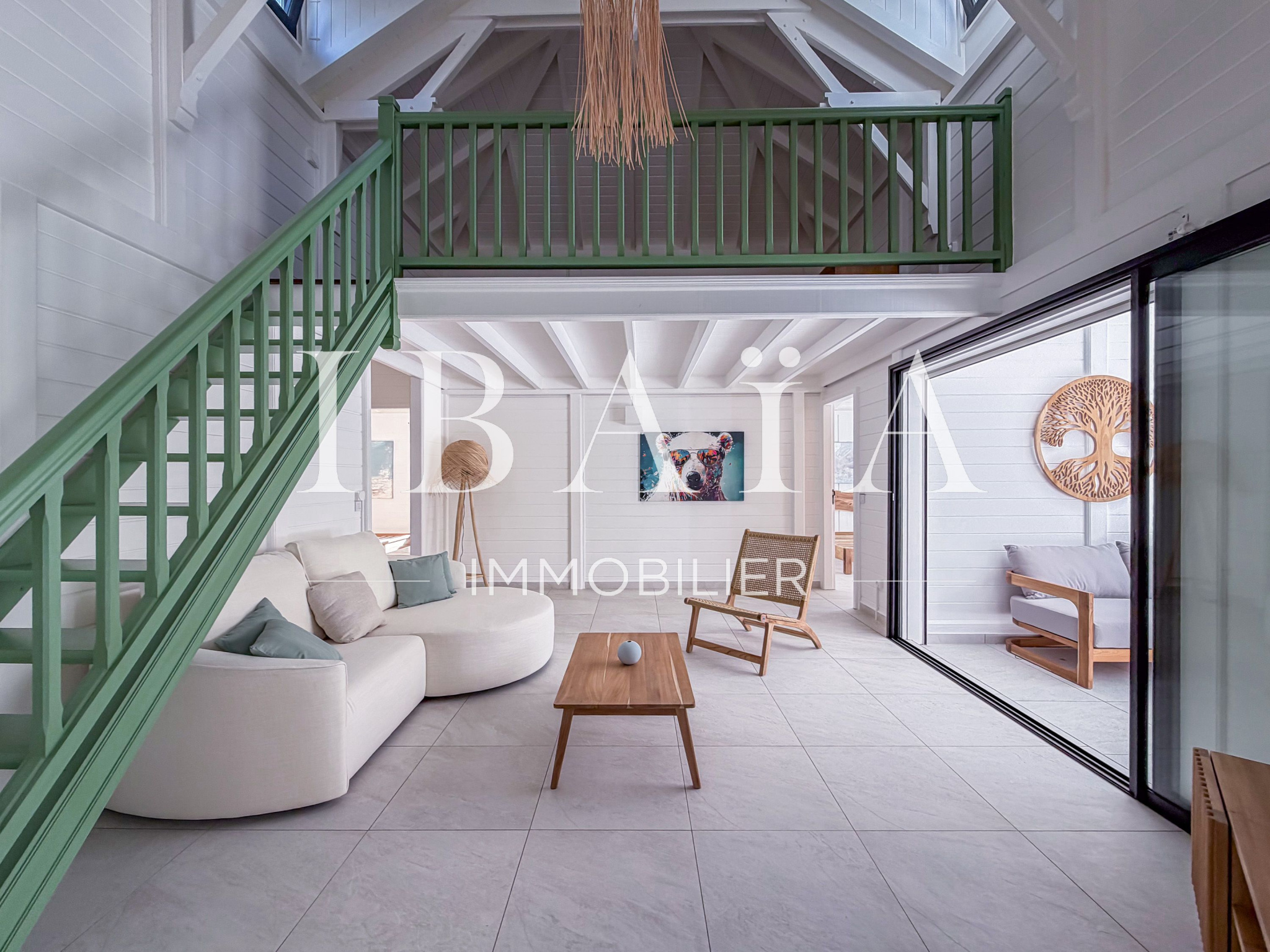 Édifiée sur une parcelle d’environ 2 700 m2 (dont une partie est non exploitable en raison de la topographie du terrain), la villa se compose comme suit : une entrée au niveau de la galerie, une grande cuisine équipée ouverte sur l’extérieur avec bar, un séjour bénéficiant d’une belle hauteur sous plafond grâce à une charpente traditionnelle, ainsi qu’une mezzanine actuellement utilisée en bureau.
